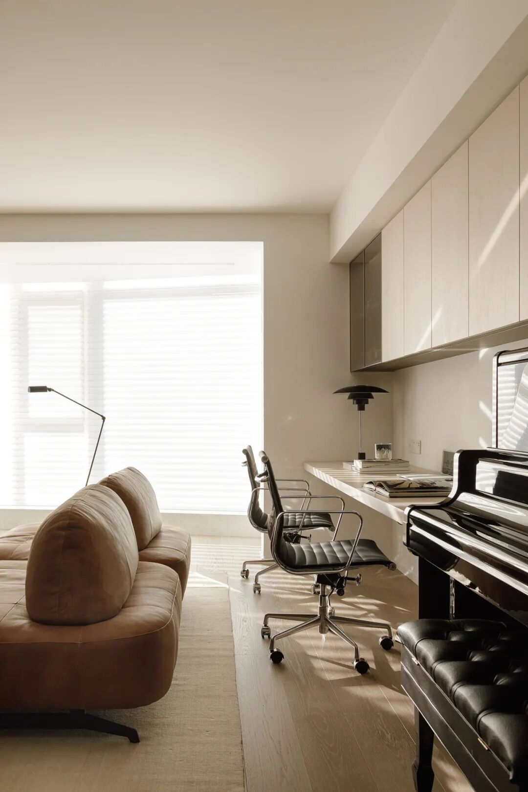 团队于材质、色彩、家电的选用也费了番心思。寻找了最接近天然的木色,大面积使用依旧松弛。壁挂画境电视,线路干净的藏在背板后。除了办公需要,悬空书桌还是辅导孩子们做作业、手工的‘主战场’。厚度达5公分,内部及两侧设计有钢结构。与黑色钢琴相搭,很有力量感。
