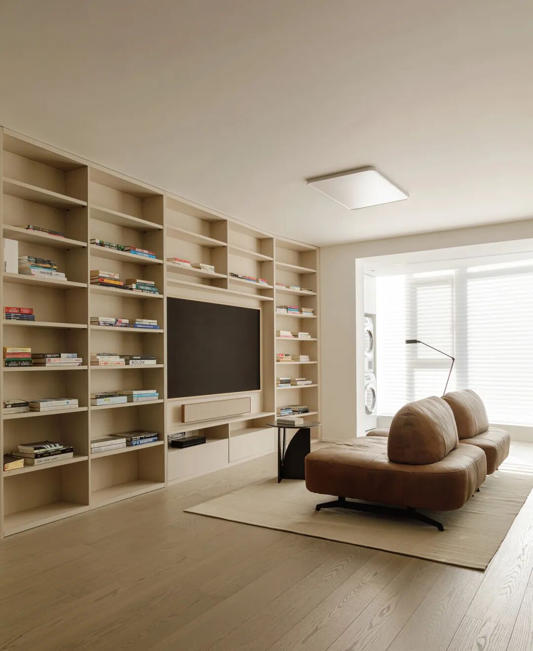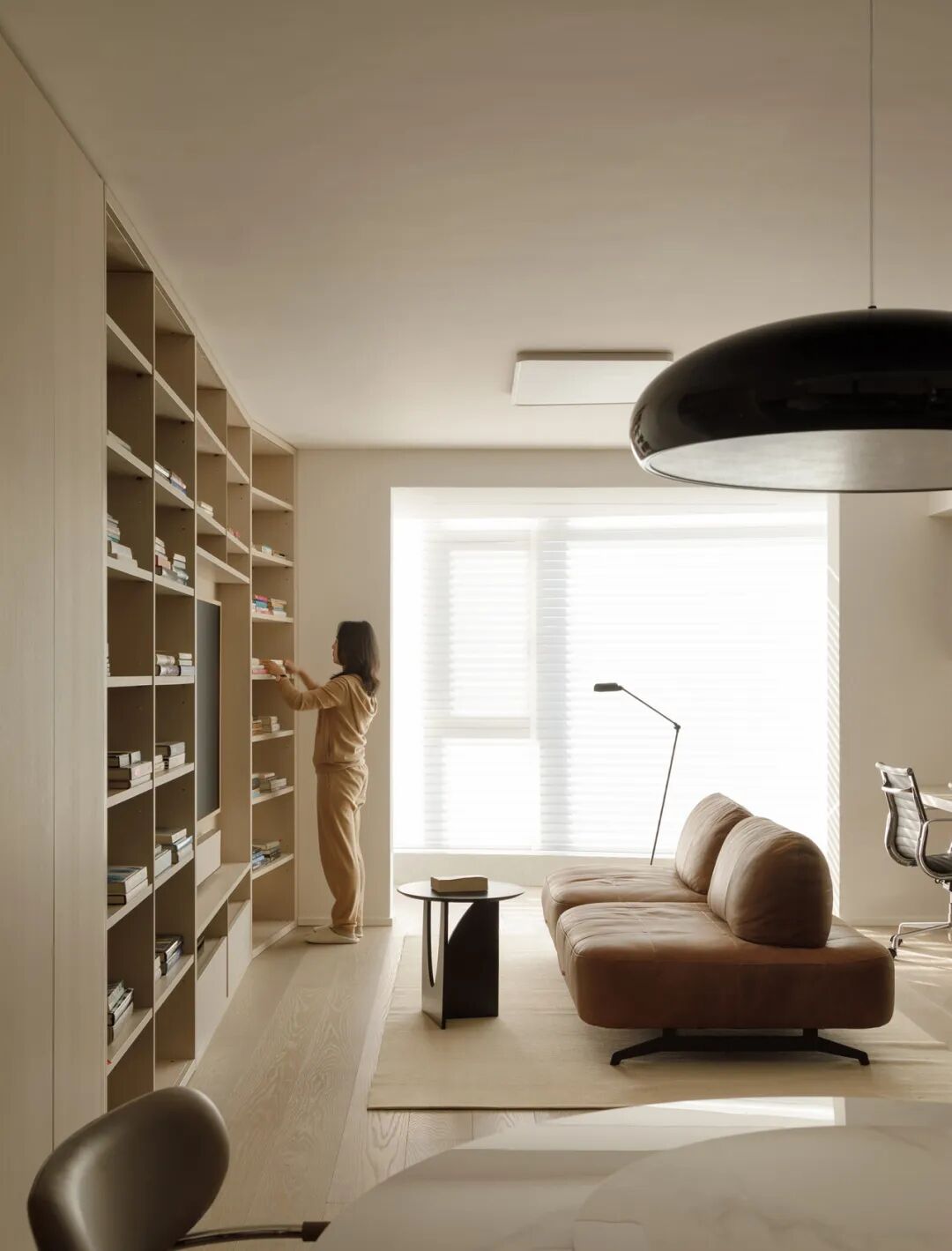 Ms.L有两个小朋友(姐姐和弟弟),都尚年幼。她希望用‘润物细无声’的引导,让阅读成为姐弟俩的习惯与爱好。左侧沿墙设计的整面收纳柜,一大半是书架,他们可以随时拿到书。留意着书的尺寸差异,做了大小不同的格子——像底层更大一些,弟弟也能自己选儿童绘本。长厅有近5米落地窗,搭配着百叶帘。光影千变万化,美丽且温暖。共读氛围愉悦舒适,不负好日光~