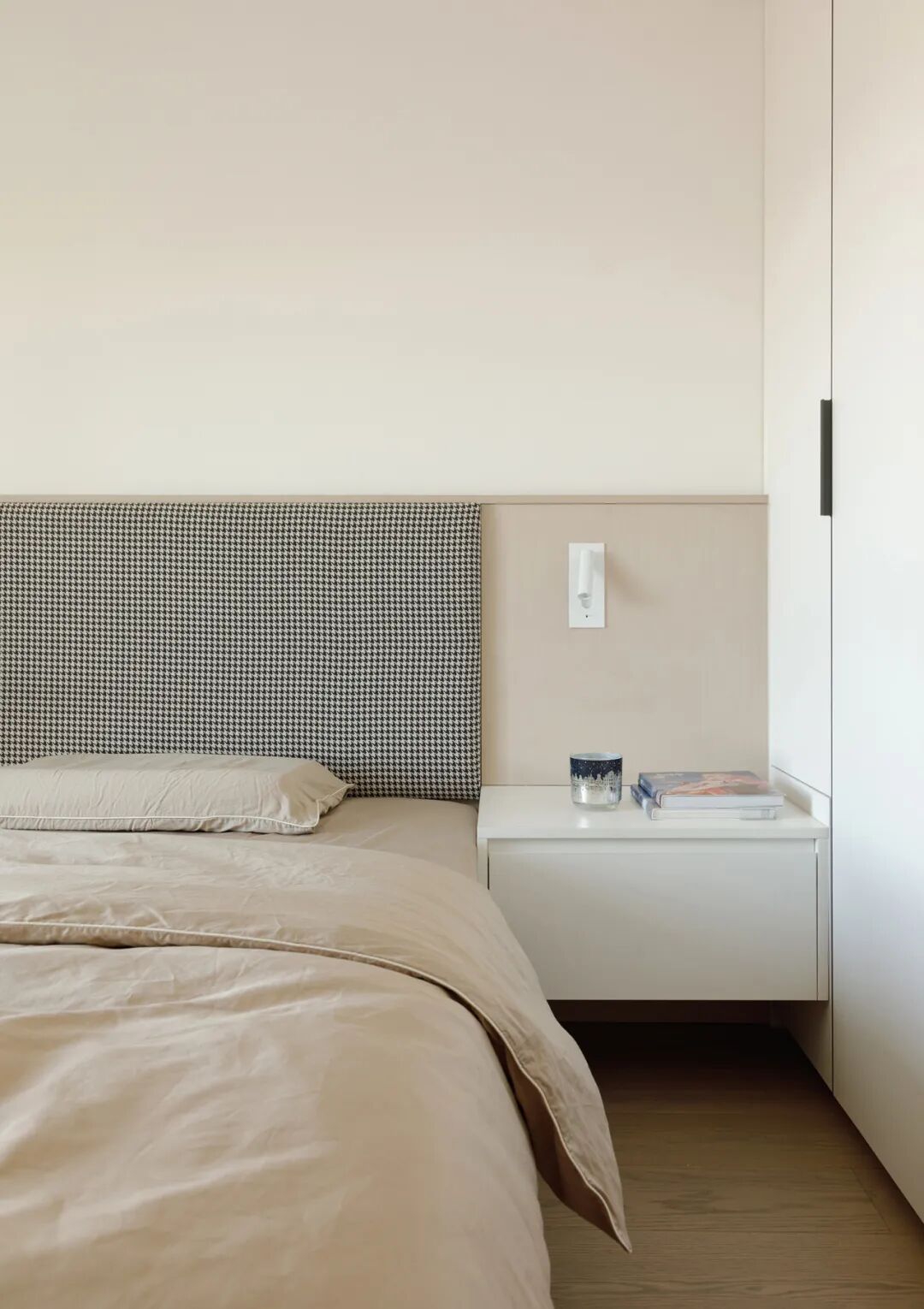 △ 姐姐房间,硕果灰床品,床头用黑色千鸟格面料。