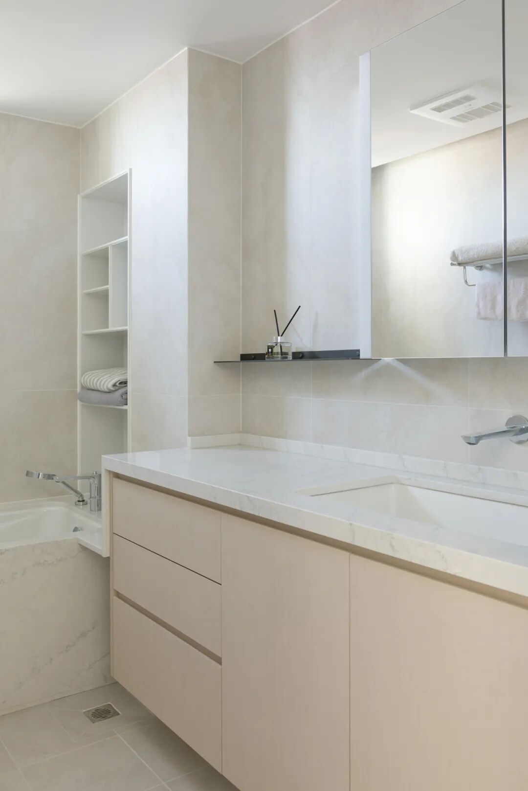 一家人有泡澡解乏的习惯。新布局同时放下了他们期待许久的小浴缸与淋浴房。