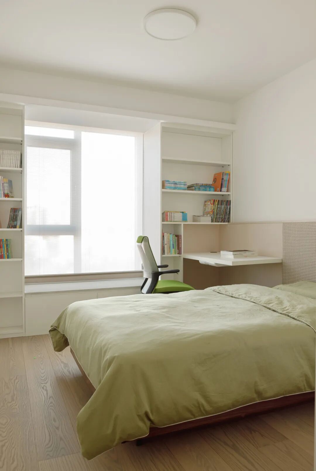△ 弟弟房间,牛油果绿床品,床头用褐色千鸟格面料。