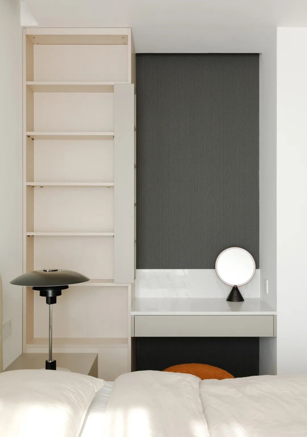 △ Ms.L的梳妆台,旁边借烟道位置做了开放格收纳。