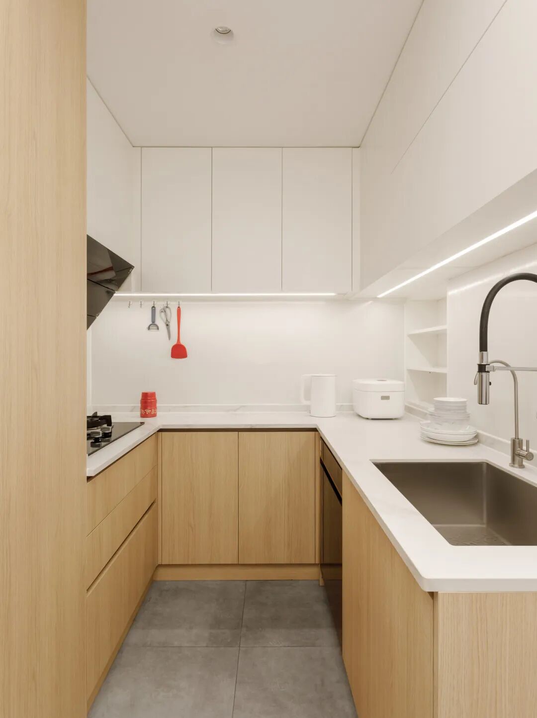 我们坚持把厨房换至中间,获得了较宽裕的操作区。上下柜子是U形布局,收纳量可观。并得以放下水处理设备和一个小洗碗机。有智能产品减轻家务量,生活品质不打折扣,小家的一餐一饭常伴幸福。