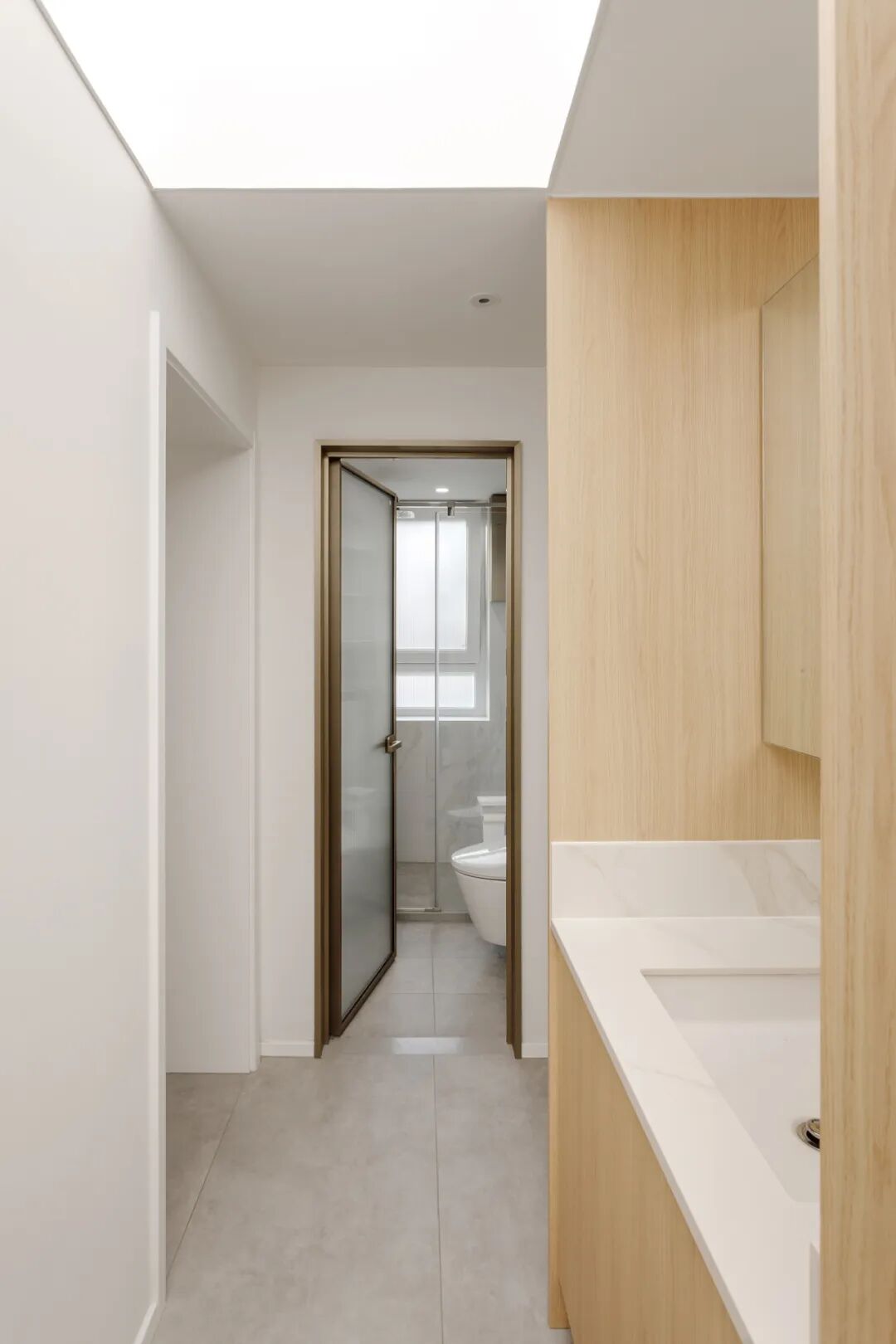 卫生间‘顺利’变身带窗户的明卫。门选择了长虹玻璃搭配金色边框,透光不透人,显通透精致。考虑三代同堂,易出现同时使用‘高峰期’,外置了洗漱台。