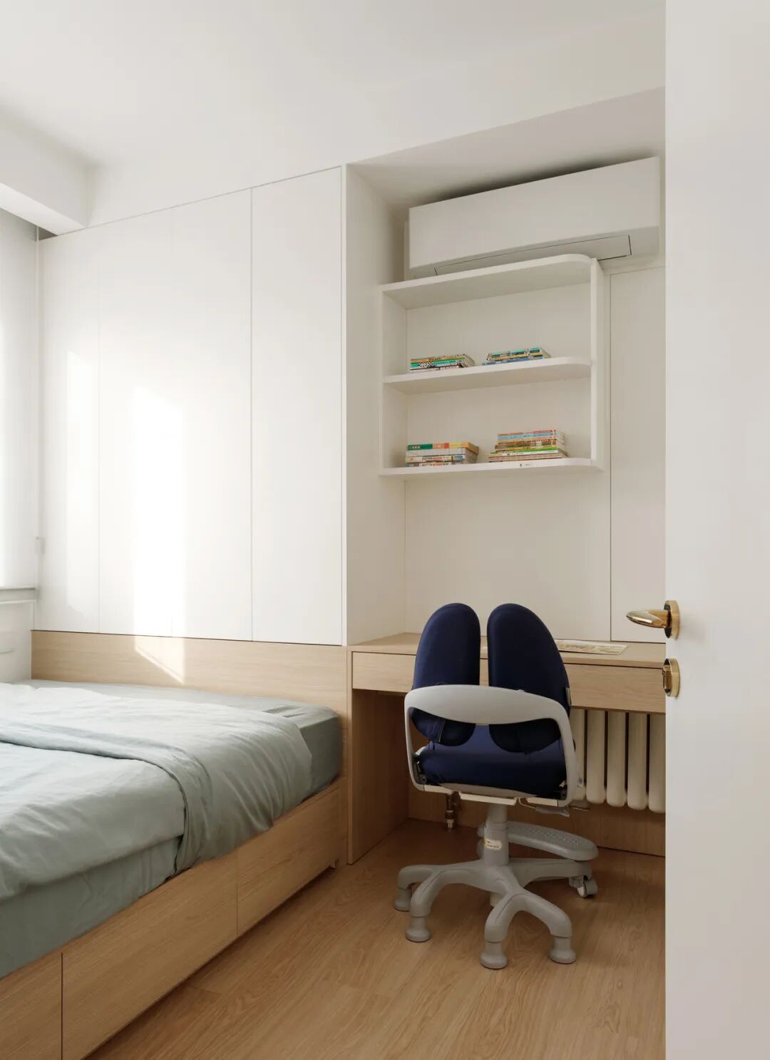 北面的房间,平时长辈居住。同时它也是小朋友下学后读书、写作业的房间。木色书桌前,借着建筑的内凹空间做了白色隐形收纳,不必担心学习用品增多无处摆放。