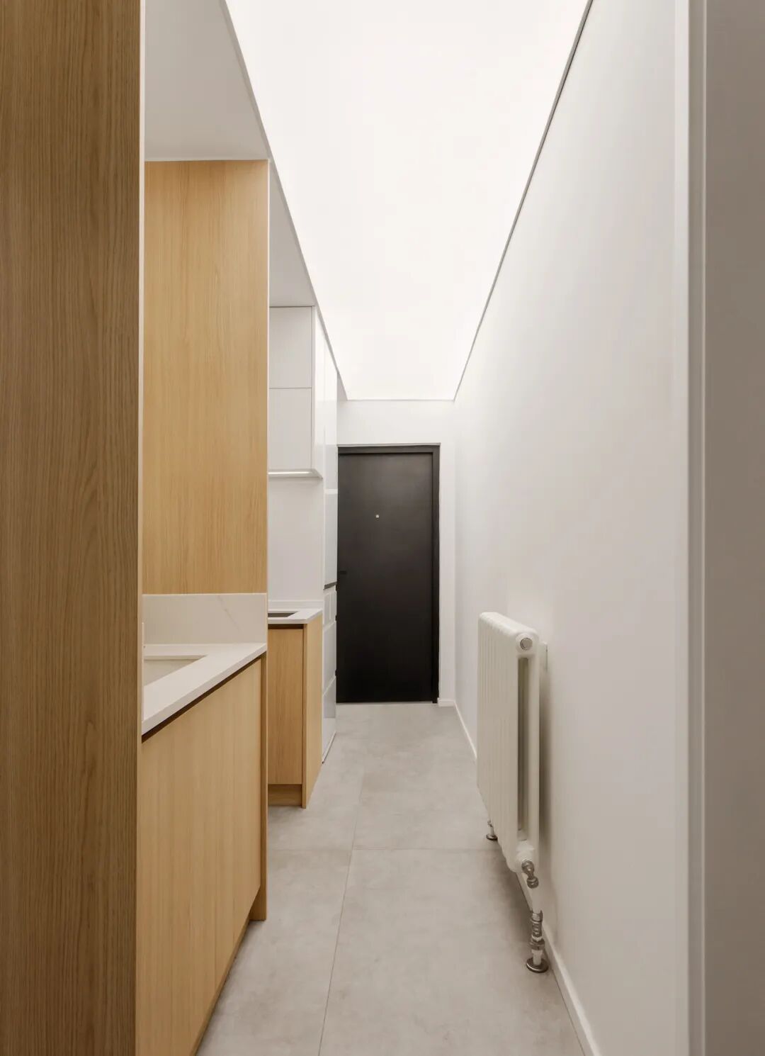 采取了高效,并适合孩子跑动的战略:留一条主通道,功能集中在一侧。原先暗卫处,改做三面顶天立地的储物柜。如今推开门,软膜天花灯柔和光线下,白色明亮、木色亲和,便捷又舒心。