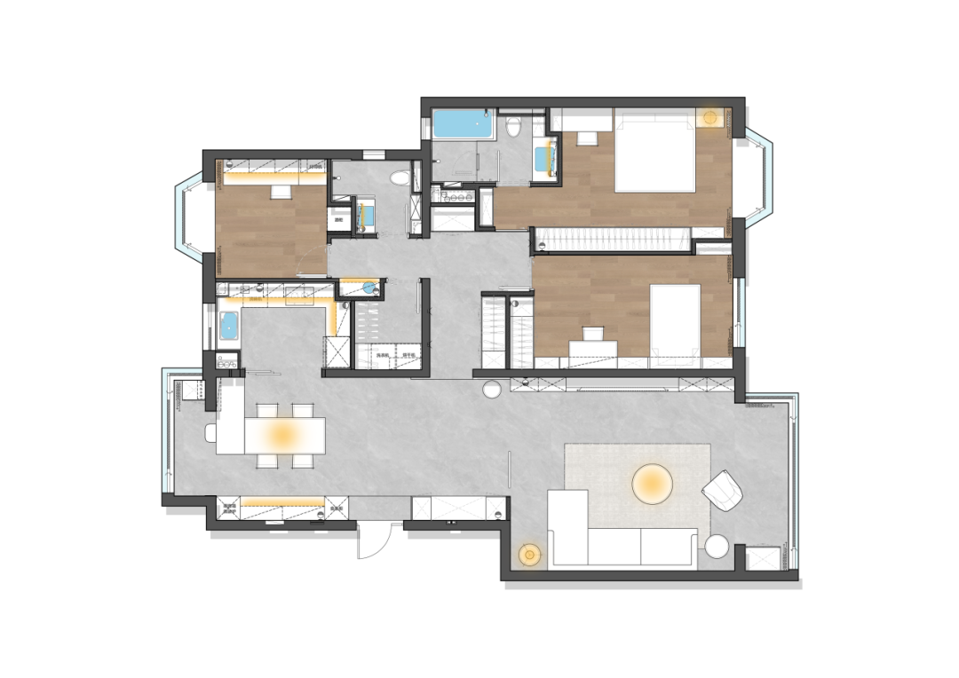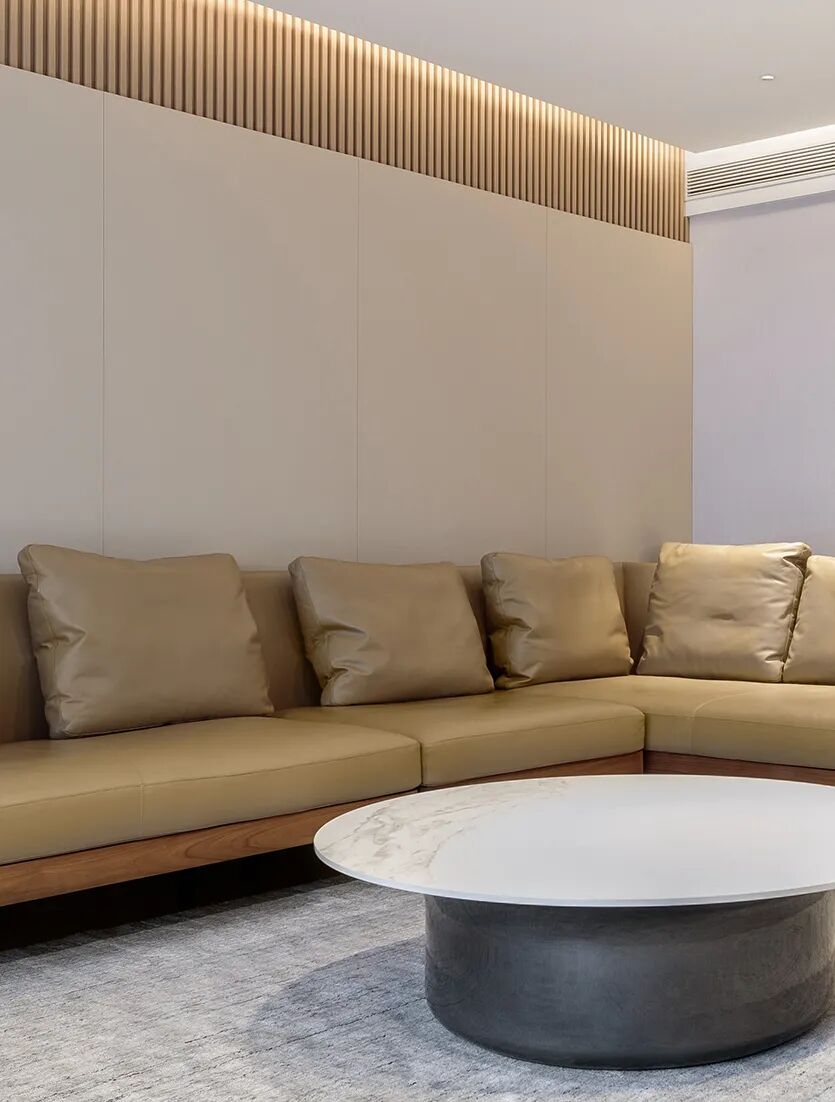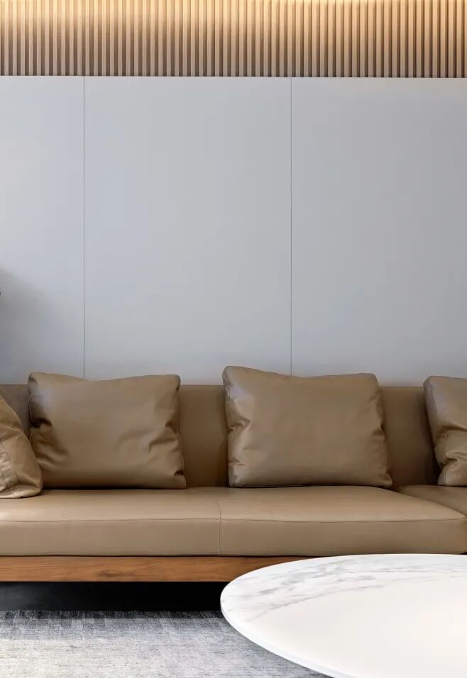 客厅将是一家三口重要的互动空间。温馨松弛些助于彼此谈谈趣事,陪小朋友玩闹观影。我们在墙面搭接了木色长城板。转角沙发背后,换了触感更细腻的皮质硬板墙。另有柔和的灯光加持、亮橘色沙发椅点缀…