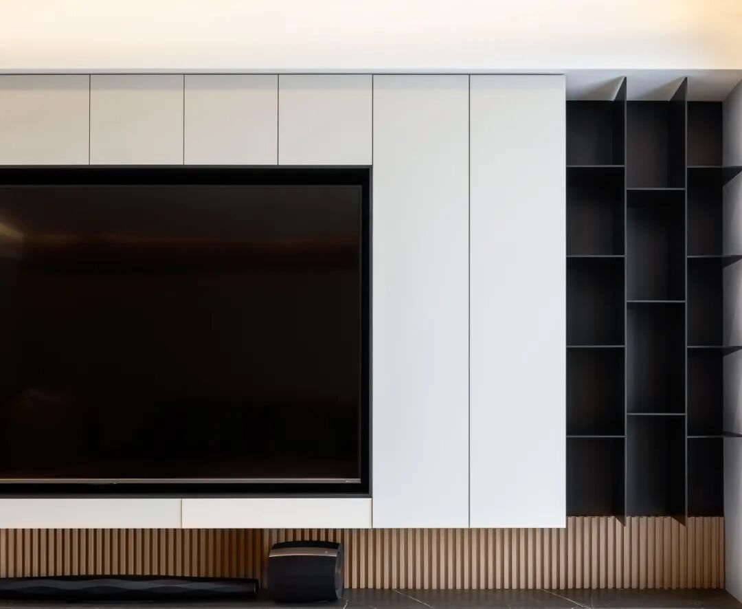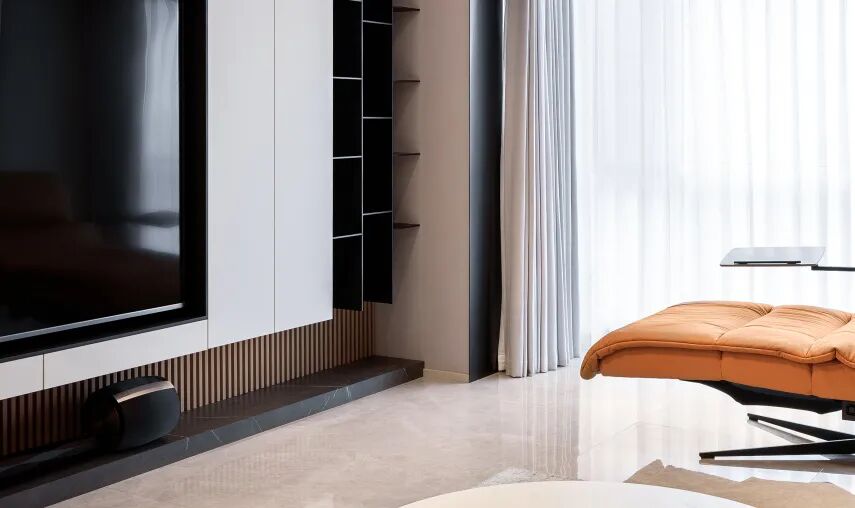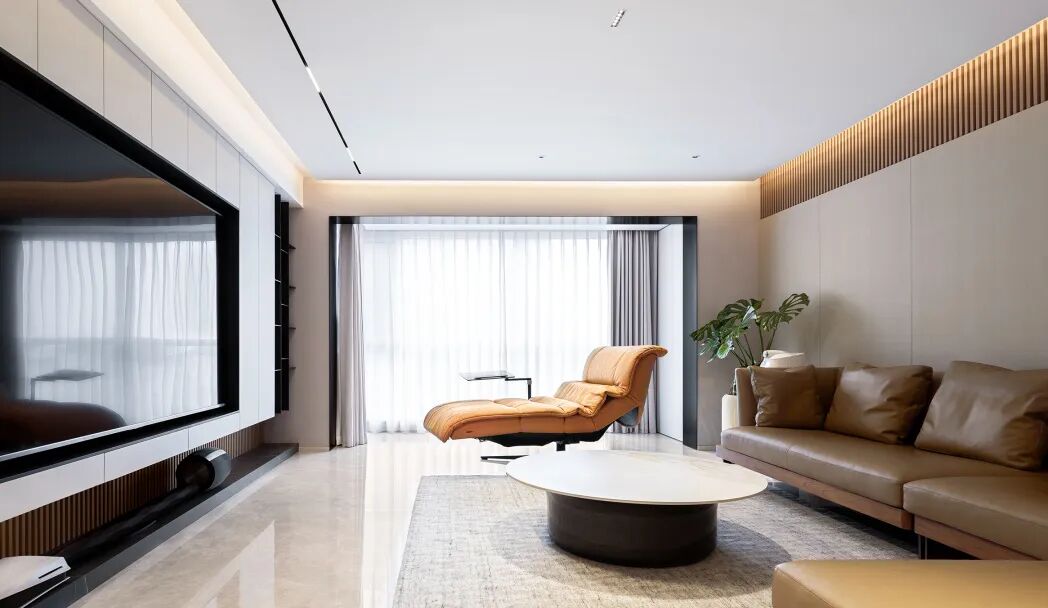 客厅自带一面L形转角落地窗,安上柔纱帘,自然光充盈又可亲。不希望打乱这份’心旷神怡‘。他们家做了一整面隐形收纳——轻按电视墙一侧的白色柜板,就能打开收纳柜。