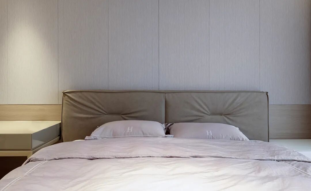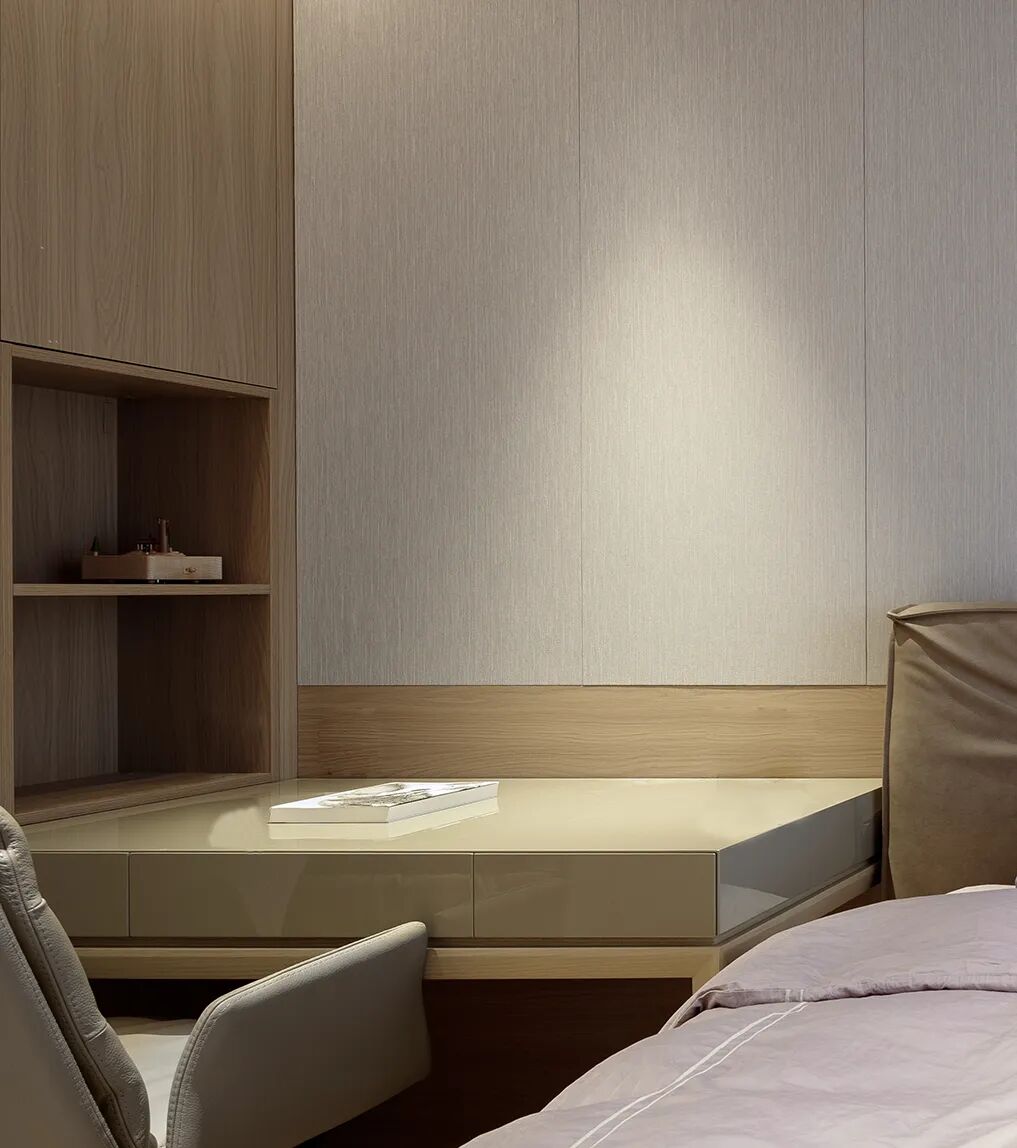 夫妻俩在家也有很长的时间要处理工作。主卧需能快速切换办公、休息模式。床侧增加了办公桌,床尾另有放文件的隔板。希望帮助他们快速进入深度睡眠。睡眠区用了更舒缓的米色壁布,并选了一款足够厚实、触感软糯的床垫。