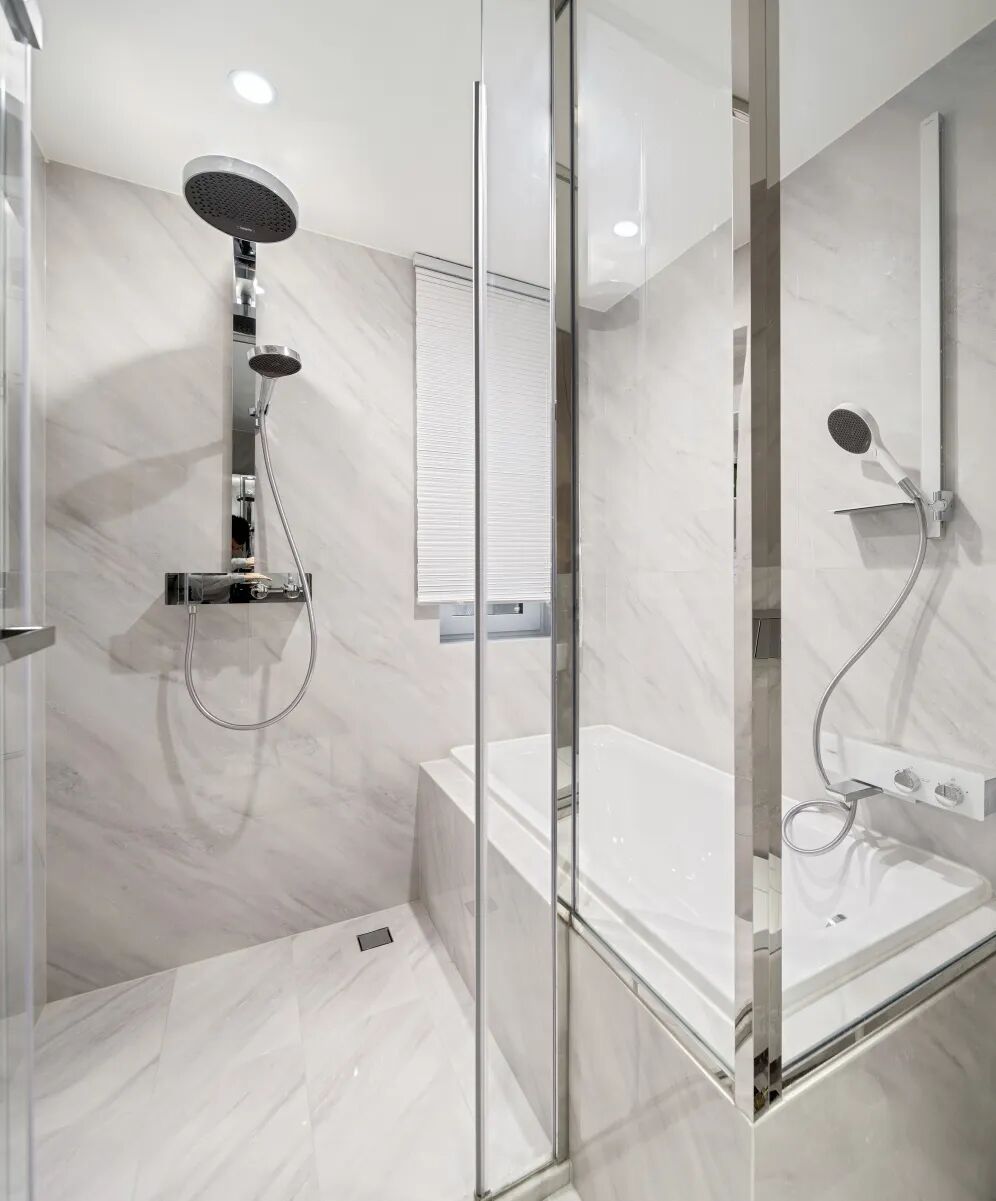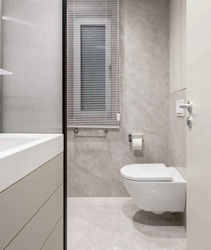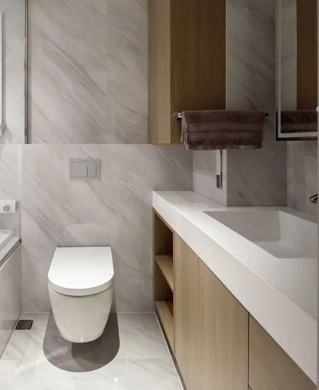 主卫墙地覆盖着卡拉卡白大理石,明亮清爽。考虑小朋友有泡澡的习惯,嵌了一个小浴缸。我们稍稍缩窄了洗漱台面,留出空间给需要在浴室完成的‘动作’:卸妆、洗漱、最重要的便于孩子更换衣物。