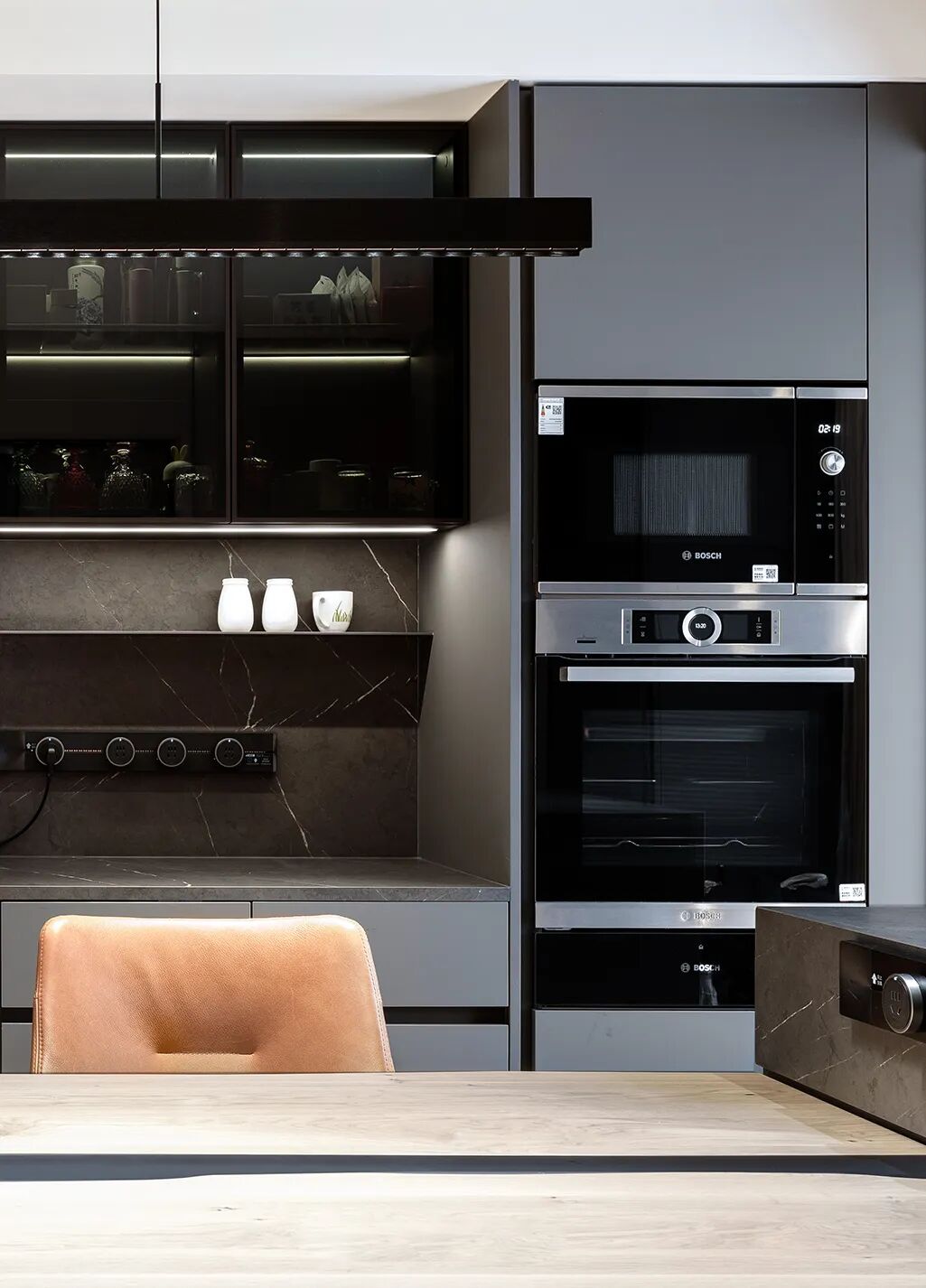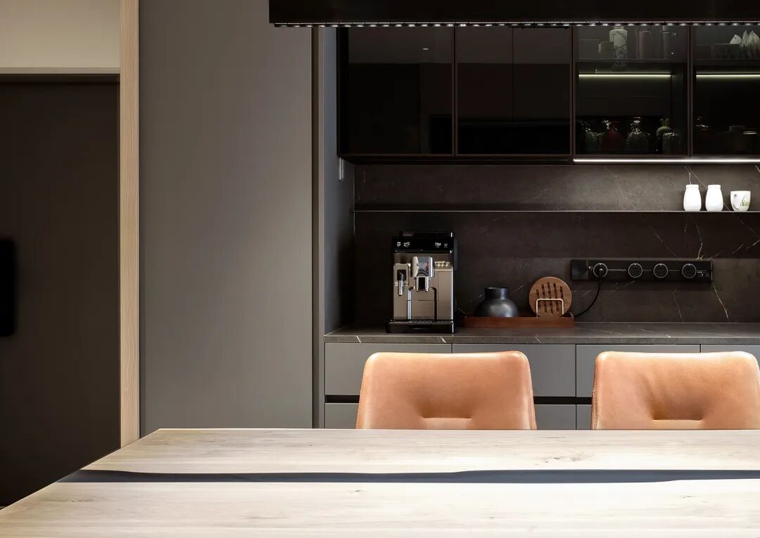 董先生很喜爱穿插在空间中的暗色金属、大理石台面。彰显着精致、冷静,更具力量。布置了一条金属置物层板,可以展示喜欢的物品。