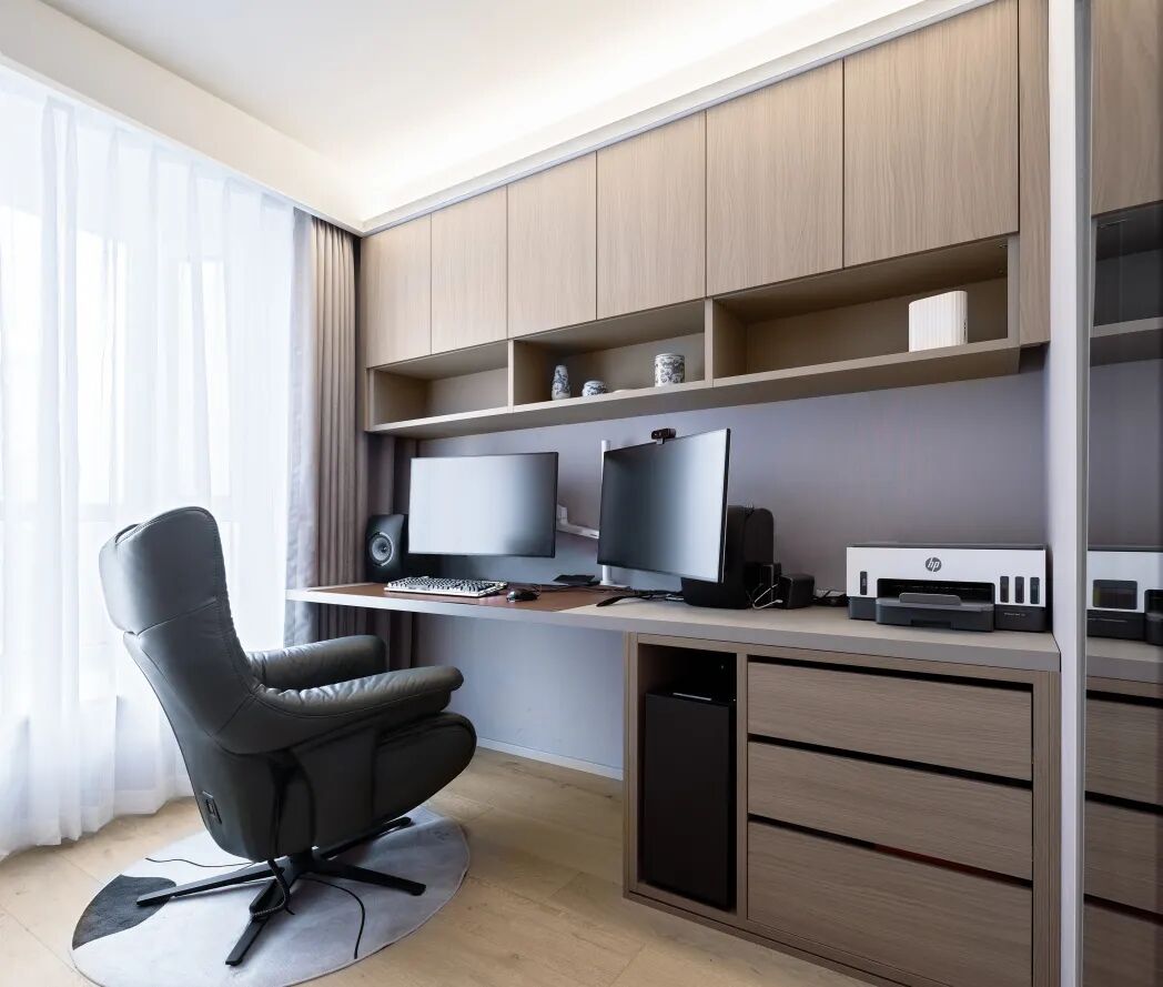 董先生在家的办公房,安置了一条长排书桌,能双屏工作。音响、打印机、文件各有位置收纳。