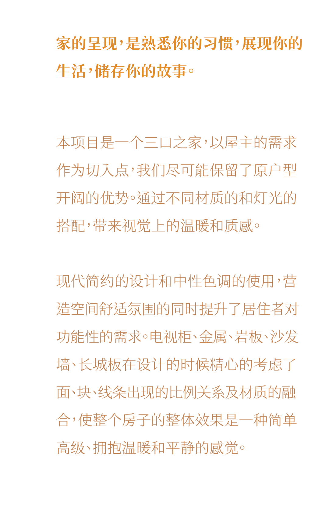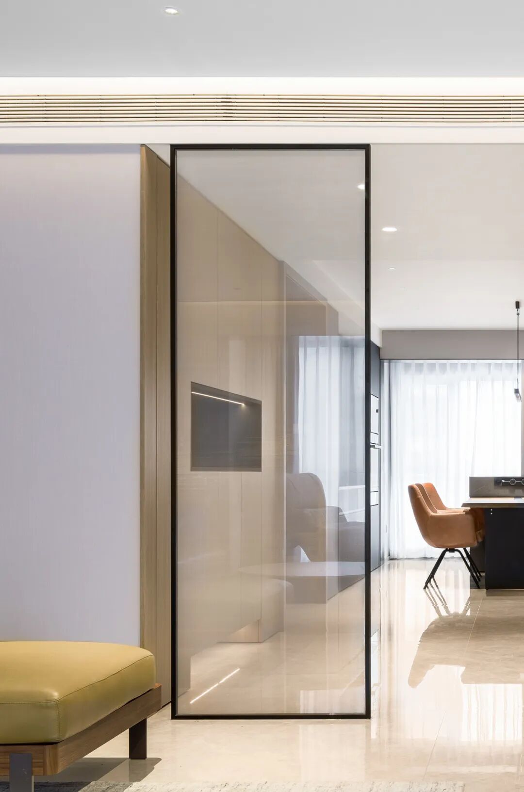 待走进不同空间,却不难发现他家对材质、灯光...格外讲究:静区入口,木质格栅发散暖意。通往客厅,一面窄窄的银丝玻璃屏风,增添仪式感。作为奔跑在21世纪的精英人士,董先生与妻子忙碌之余,要陪伴孩子成长。家‘不吵闹’、好打理、动线直截了当,才贴切他们‘雷厉风行’的作息。趣味与氛围,另由细节诠释。