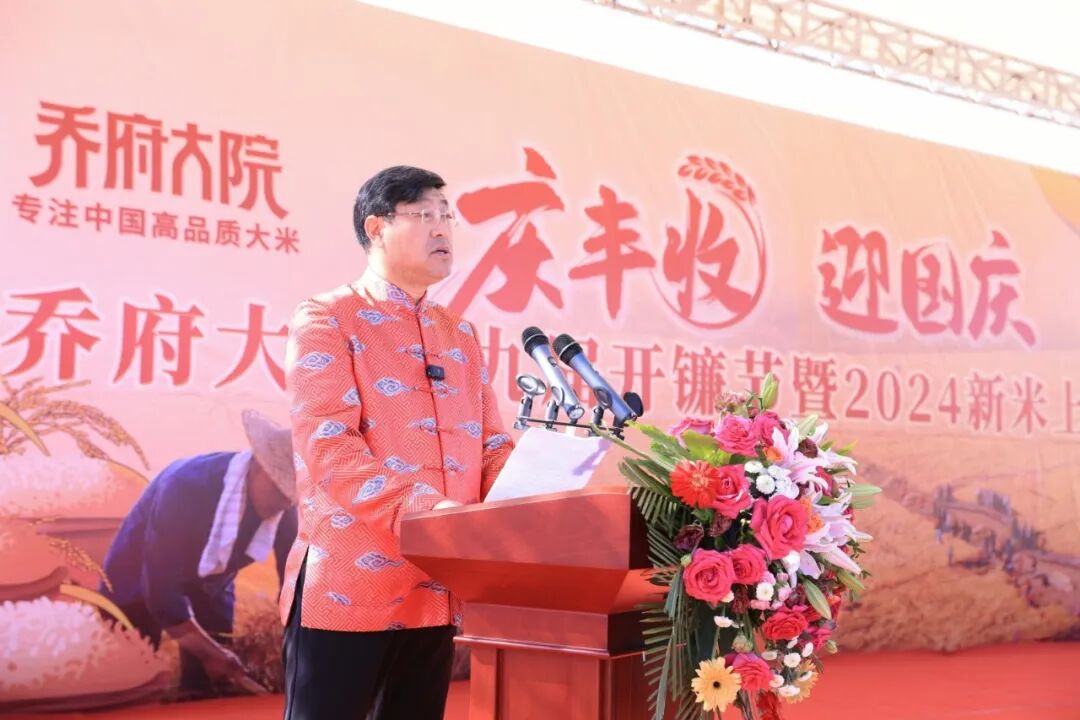 乔府大院党委书记、董事长乔文志在致辞中表示,乔府大院专注五常大米产业26年,始终秉承“传承稻米文化,铸造民族品牌”的发展愿景,牢记“为耕者谋利、为食者造福”的初心使命。在国家政策的有力支持和广大农民兄弟的辛勤耕耘下,乔府大院迎来了又一个丰收年,以这份丰收的累累硕果向即将迎来75周年华诞的祖国母亲献礼。