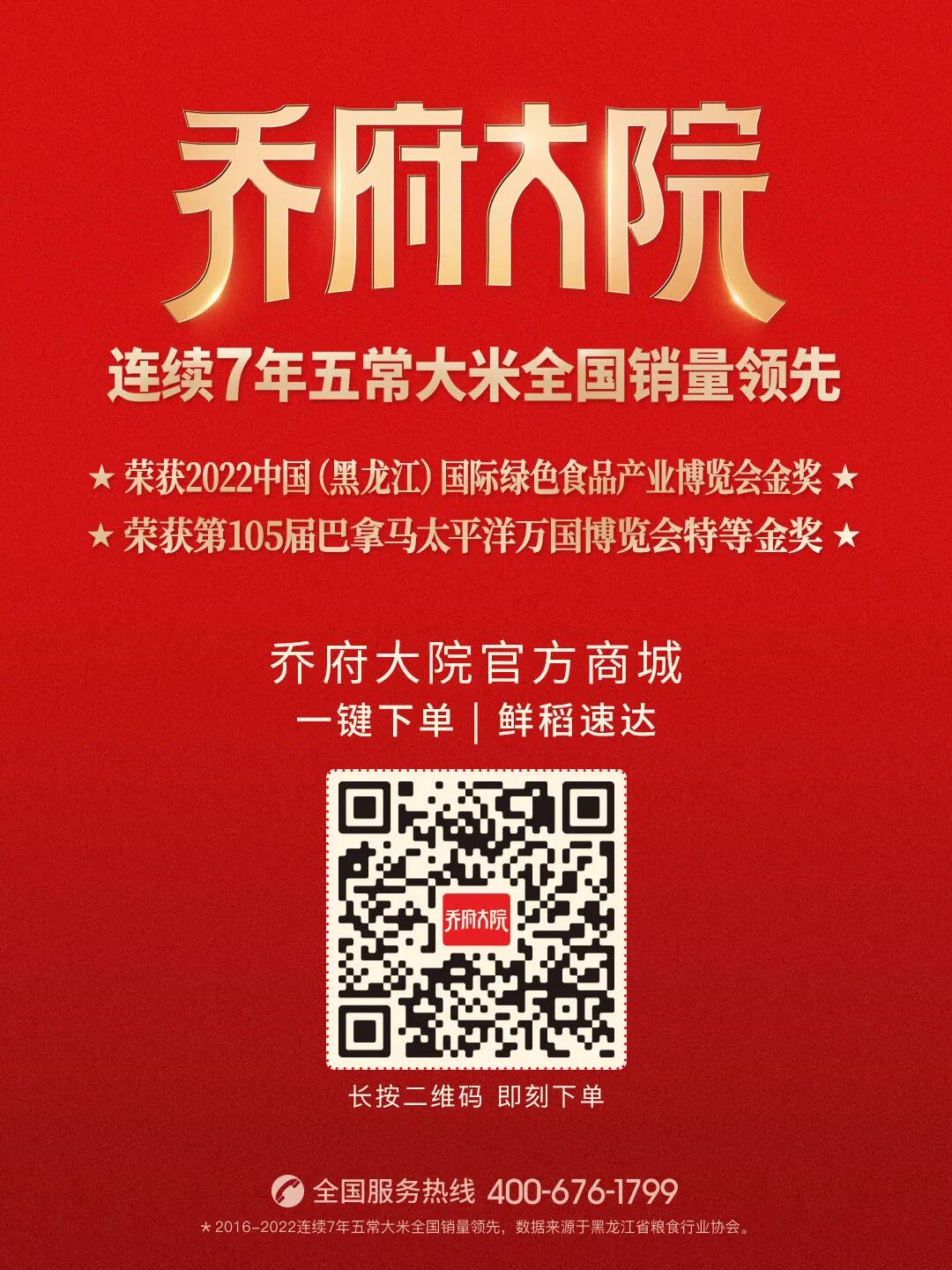 乔文志董事长在接受专访时表示,乔府大院始终坚守“为耕者谋利 为食者造福”的初心使命,秉承“传承稻米文化 铸造民族品牌”发展愿景,经过20余年砥砺发展,现已成为五常大米的领军品牌,2016-2022连续7年五常大米全国销量领先。