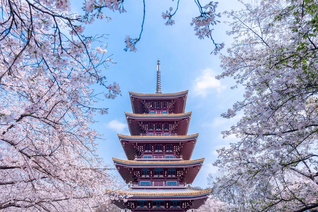 看通透明亮的五重楼与樱花交相呼应