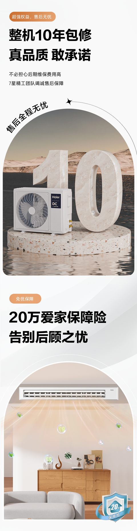 3、20w保障险:①保障范围24年1月20日起用户购买的产品(以发票或收据时间为准),产品保修期内中央空调安装不当或产品质量问题造成漏水带来的直接财产损失,由平安财险青岛分公司赔付,最高赔付20万;②安装网点必须为海尔授权网点,非授权网点不在此范围内;③产品范围:线上线下销售的海尔品牌的家用中央空调(风管机、小多联、天水地水、天氟地水、新风机产品)。