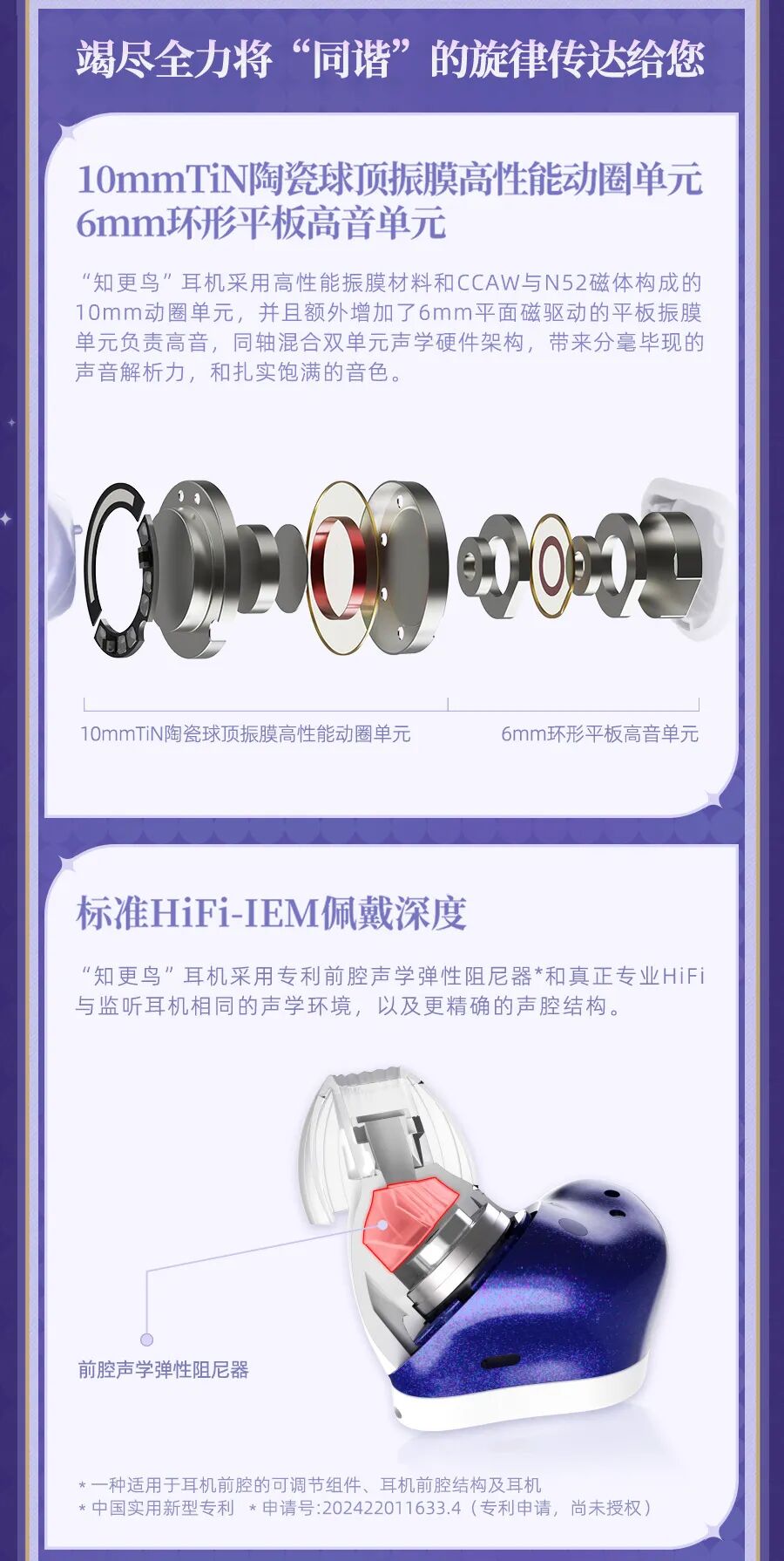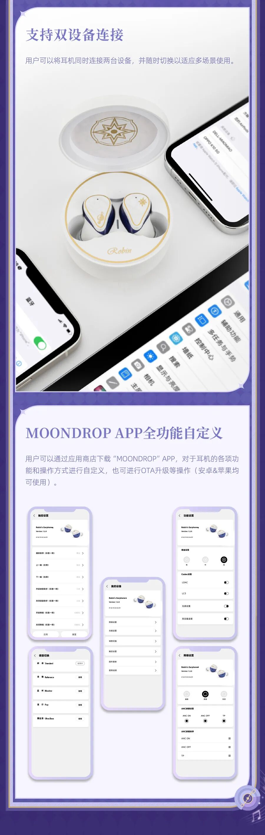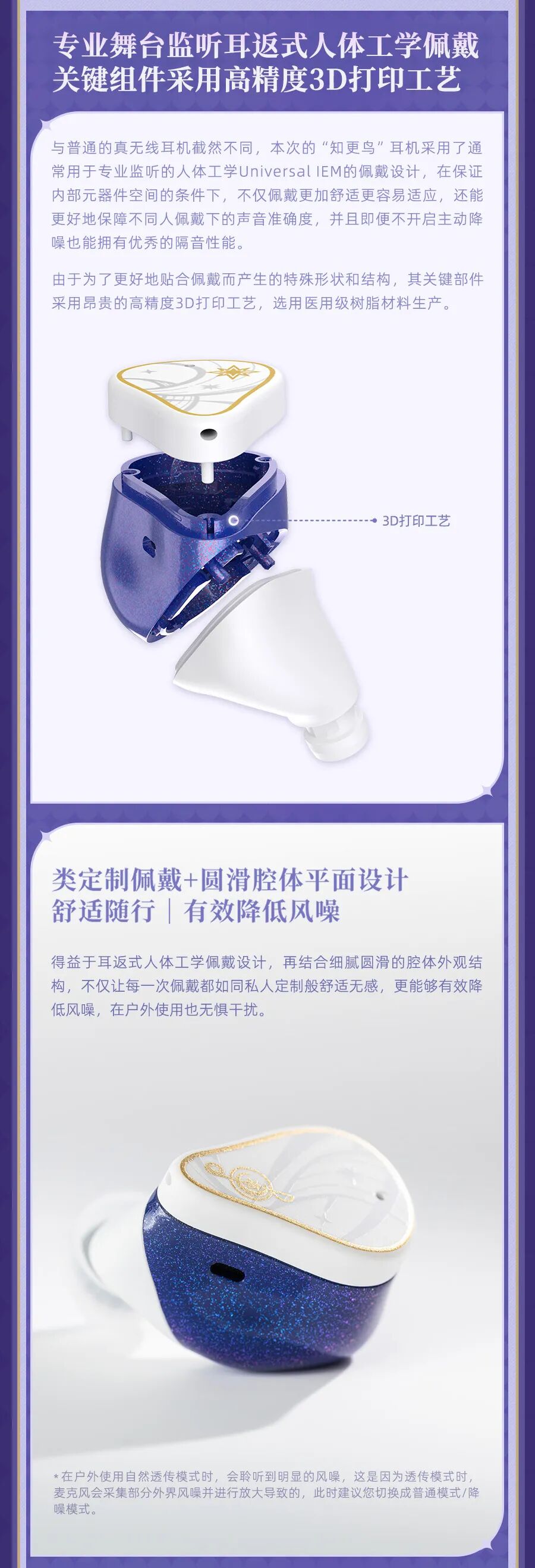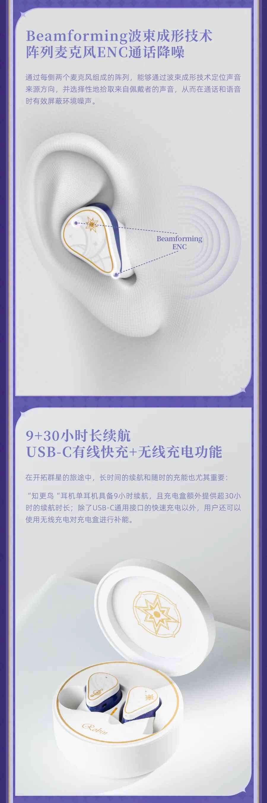 由真无线降噪·动圈平板混合双单元打造的耳机本体,能有效降低风噪,为开拓者提供沉浸式的“同谐”旋律享受。机身采用星光质感的烤漆工艺,随光影变化展现知更鸟的华服质感。耳机配备定制充电仓、定制皮质收纳包,更推出知更鸟专属语音包,期待开拓者的解锁!