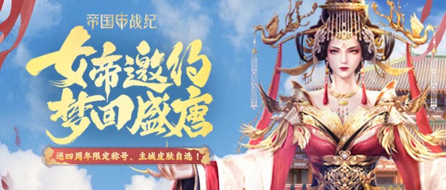 神风凌空,光耀四方,福泽天下,万民臣服!想要获得四周年限定主城皮肤【盛世唐城】吗?(五星状态下上阵英雄防御+330)那就一定不要错过这个活动!