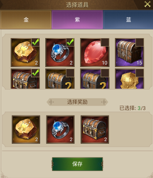 奖池由2个固定金色奖励和7个自选奖励组成,领主可在金、紫、蓝三阶奖品中选取心仪的奖品组成独属自己的专属奖池哦~