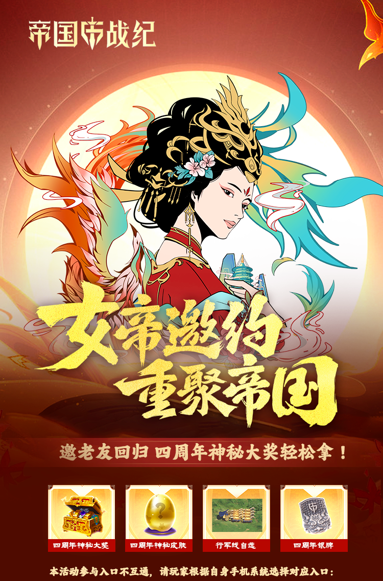 ● 【女帝邀约 重聚帝国h5活动】通过邀约老友回归游戏或流失老友自行回归即可获得四周年神秘皮肤、四周年神秘大奖、自选行军线;