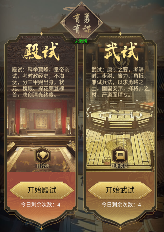 选贤举能,与则天女帝共绘盛世蓝图的梦之队伍!活动期间,参加殿试的答题活动和武试的闯关活动都会获得相应的殿试积分或武试积分。
