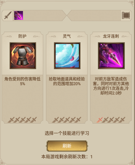 击败敌军后有几率掉落【经验宝石】,拾取可获得经验并提升等级,升级后有三种奖励可供选择,包括新的攻击方式或提升现有的攻击方式。