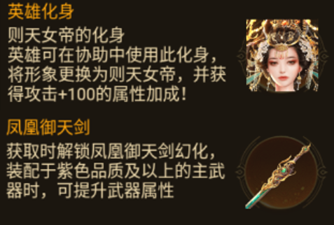 固定金色奖励由则天女帝化身和凤凰御天剑构成,其中则天女帝化身能为英雄带来攻击+100;而凤凰御天剑在装配于紫色品质及以上的主武器时,可提升武器整体属性!