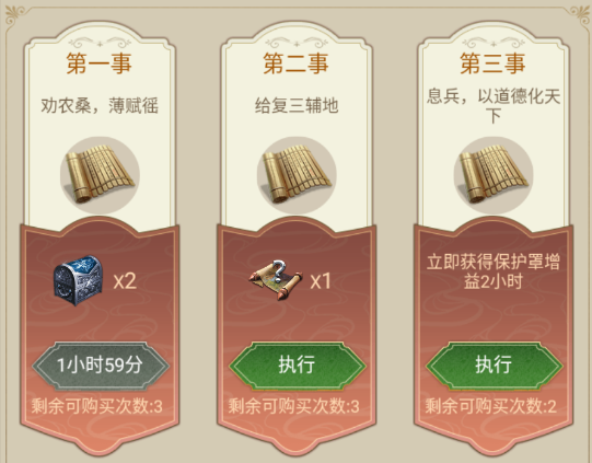 活动期间,领主每日可在12件事中免费建言5次,完成建言即可获取该事件下的建言奖励。