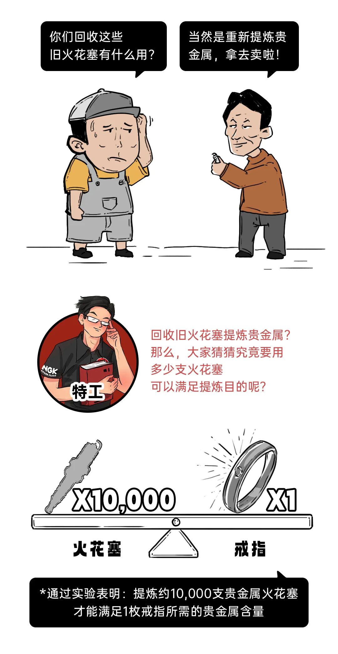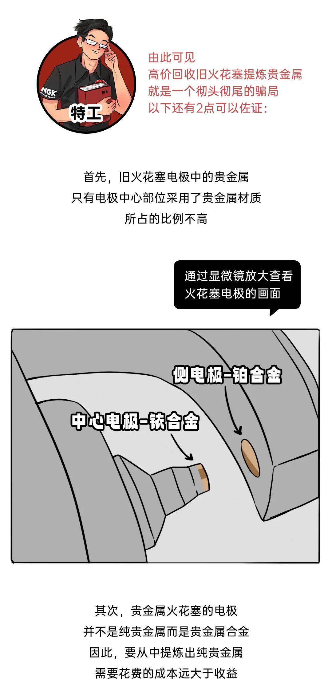 高价回收旧火花塞,拿去提炼贵金属是不可信的。实验表明,提炼约10000支贵金属火花塞才能满足1枚戒指所需的贵金属含量。这是因为旧火花塞电极中的贵金属只有电极中心部位采用了贵金属材质,所占的比例不高,其次,贵金属火花塞的电极并不是由纯贵金属而是贵金属合金,因此,要从中提炼出纯贵金属需要花费的成本远大于收益。