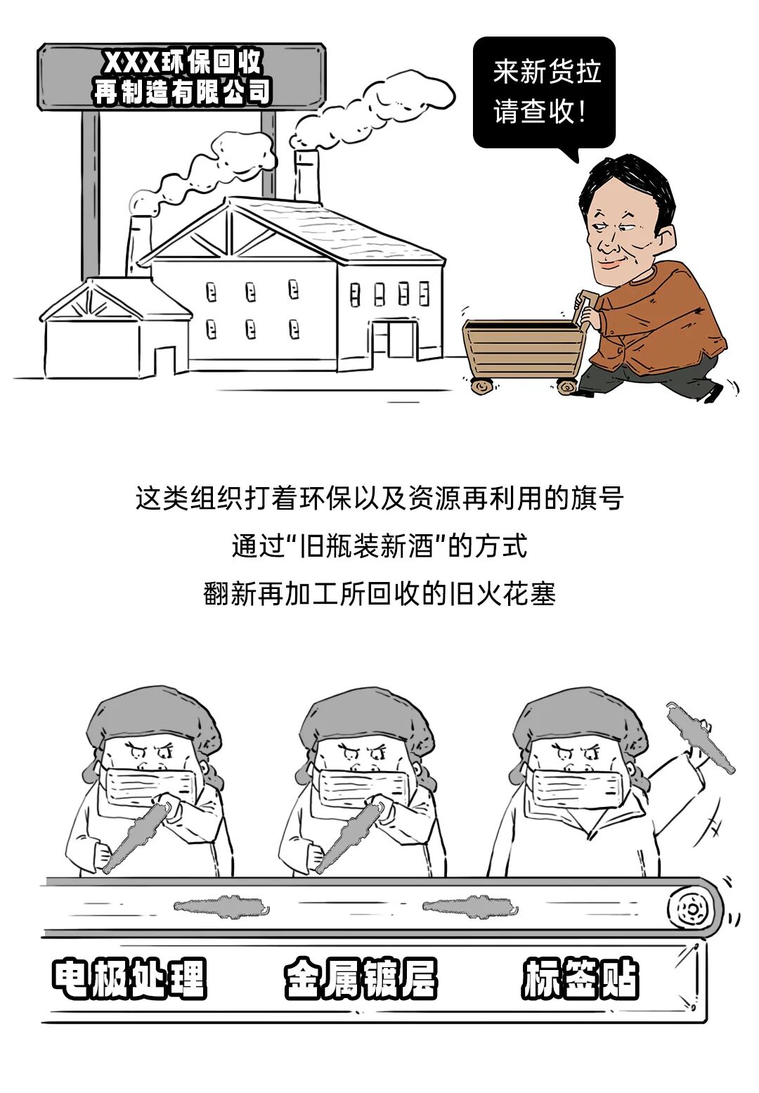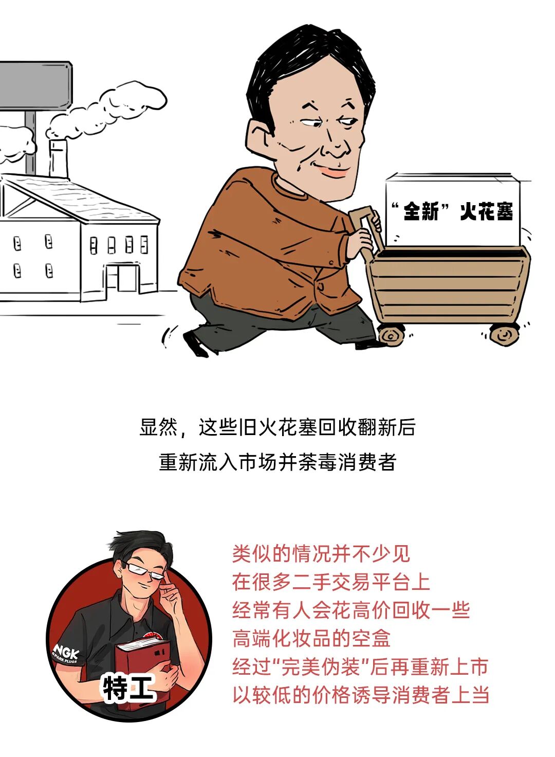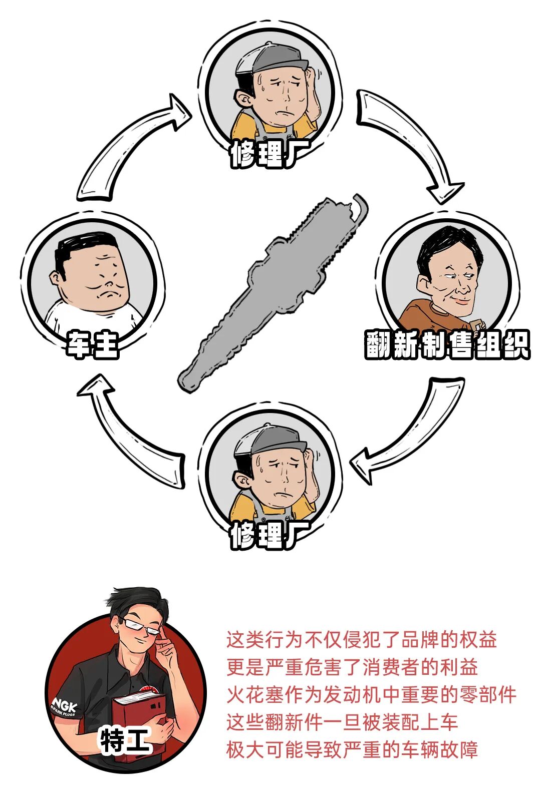 回收后的旧火花塞有很大可能被某些打着环保以及资源再利用旗号的组织或公司,拿去翻新重整,并将翻新后的产品打包出货,流入市场并荼毒消费者,从而攫取利益,旧火花塞在修理厂-翻新制售组织-修理厂-车主之间流转,不仅侵犯了品牌的权益,更是严重危害了消费者的利益,火花塞作为发动机中重要的零部件,这些翻新件一旦被装配上车,极大可能导致严重的车辆故障,比如以下3种: