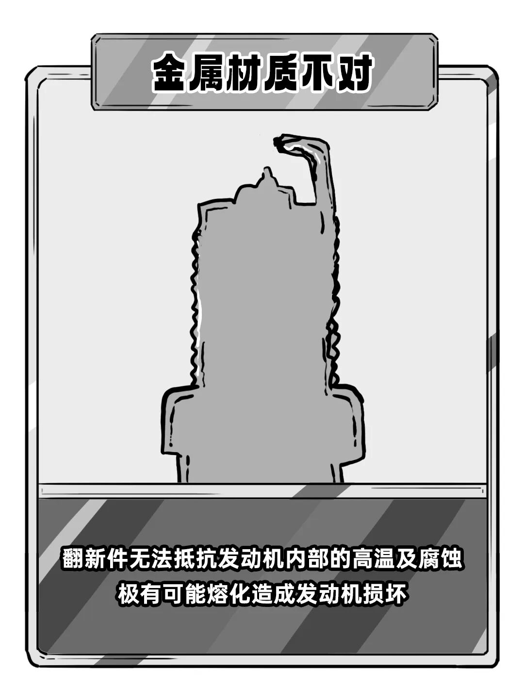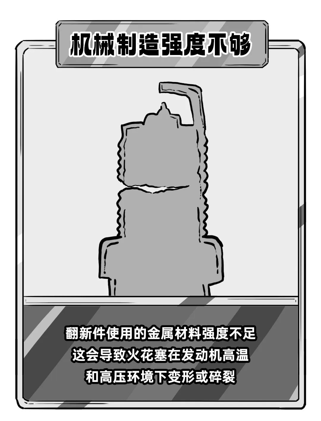 翻新件使用的金属材料强度不足,这会导致火花塞在发动机高温和高压环境下变形或碎裂。