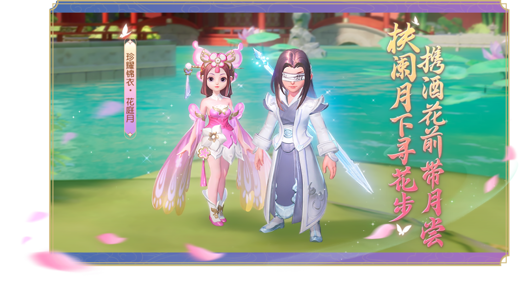 花美似人临月镜, 月明如水照花香,小可爱们快邀上小伙伴身着珍耀锦衣【花庭月】,前往三界,步入秘梦,一起并肩作战,游戏山水!