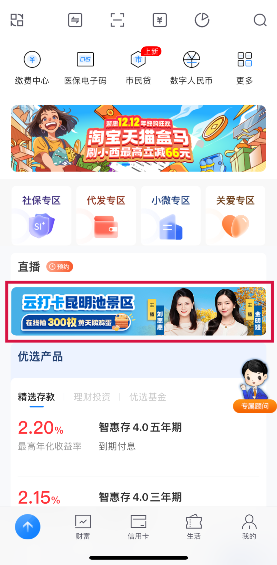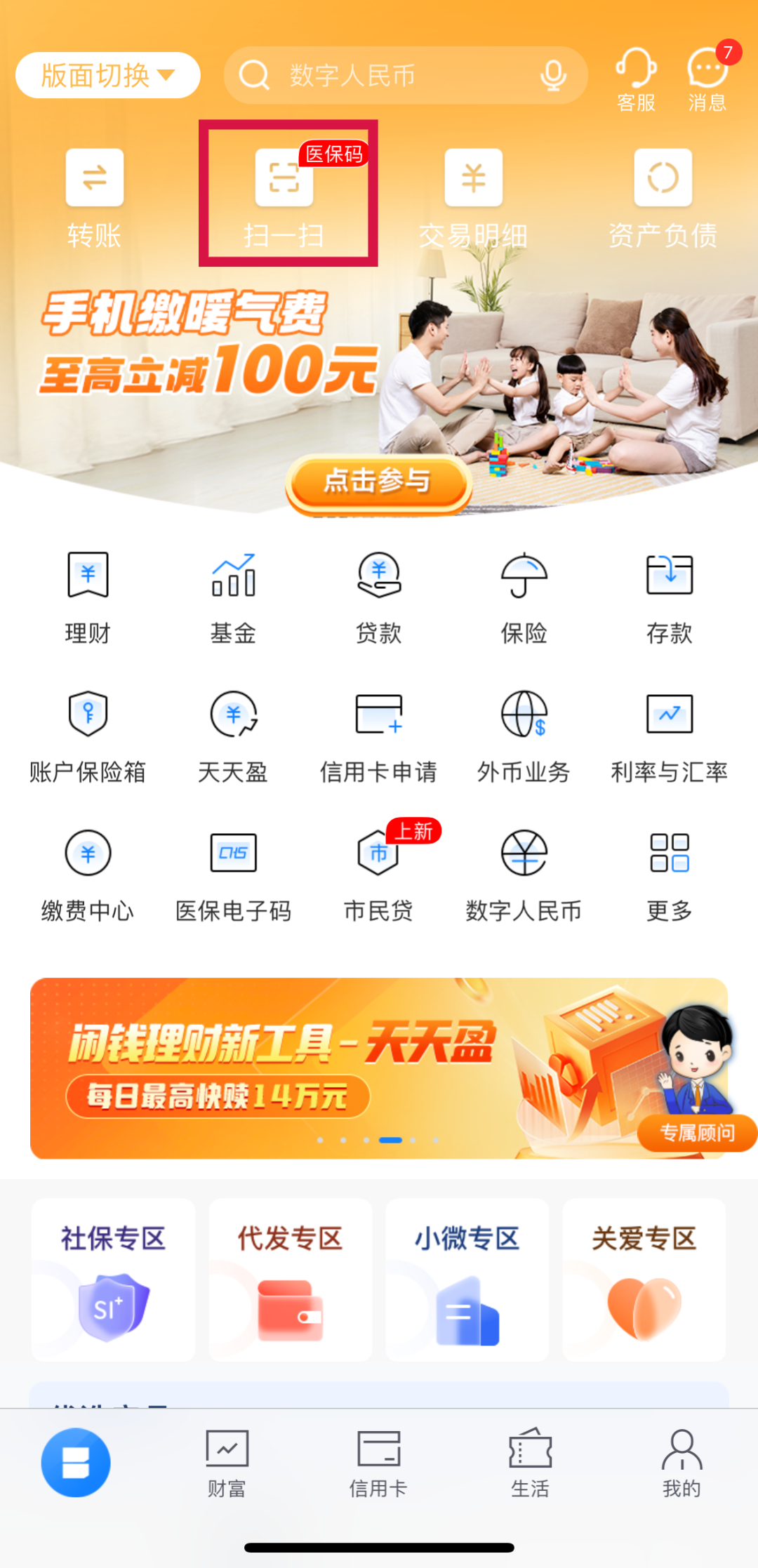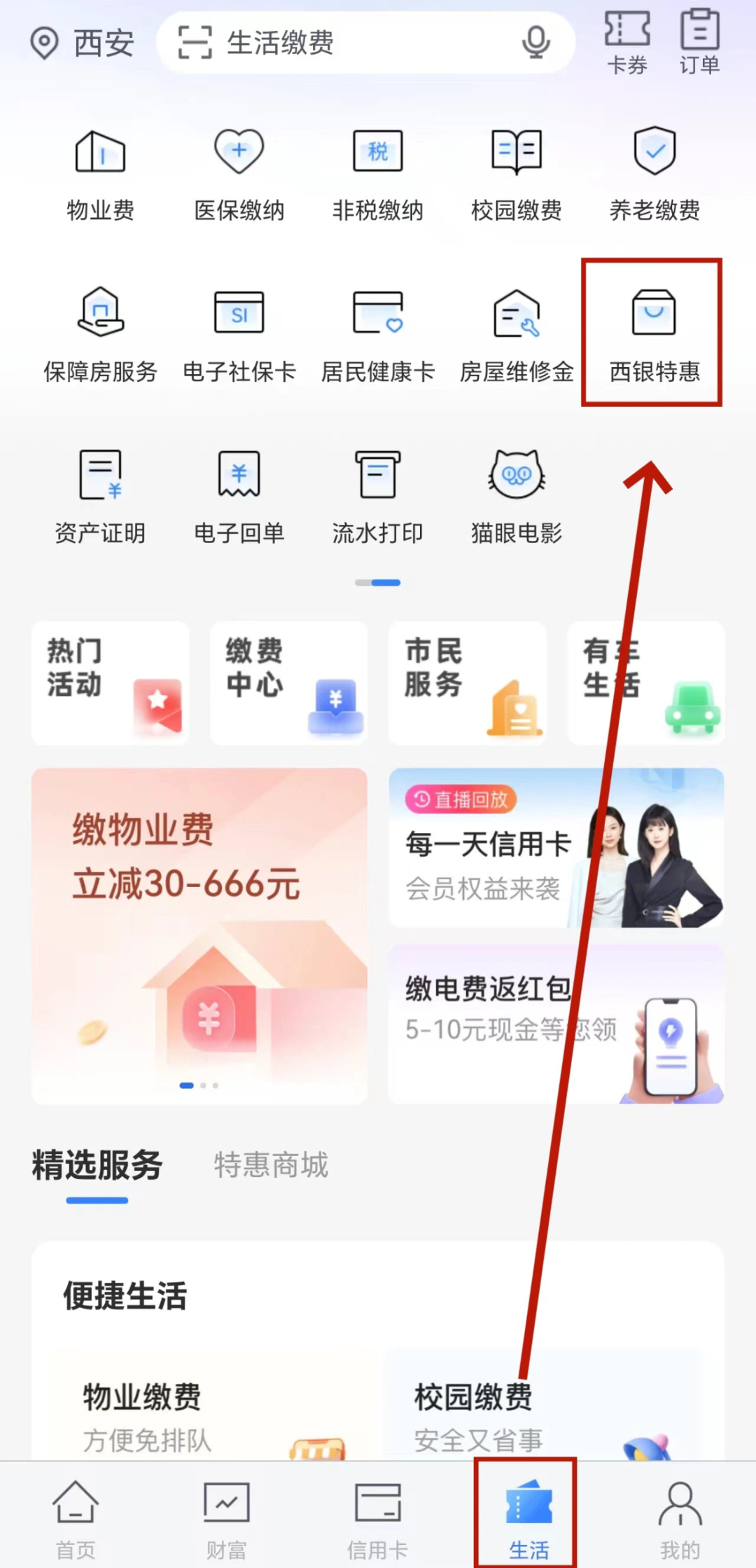 打开西安银行手机银行进入首页,点击扫一扫扫描景区内西银惠付付款码,即可享受满10元立减5元优惠。