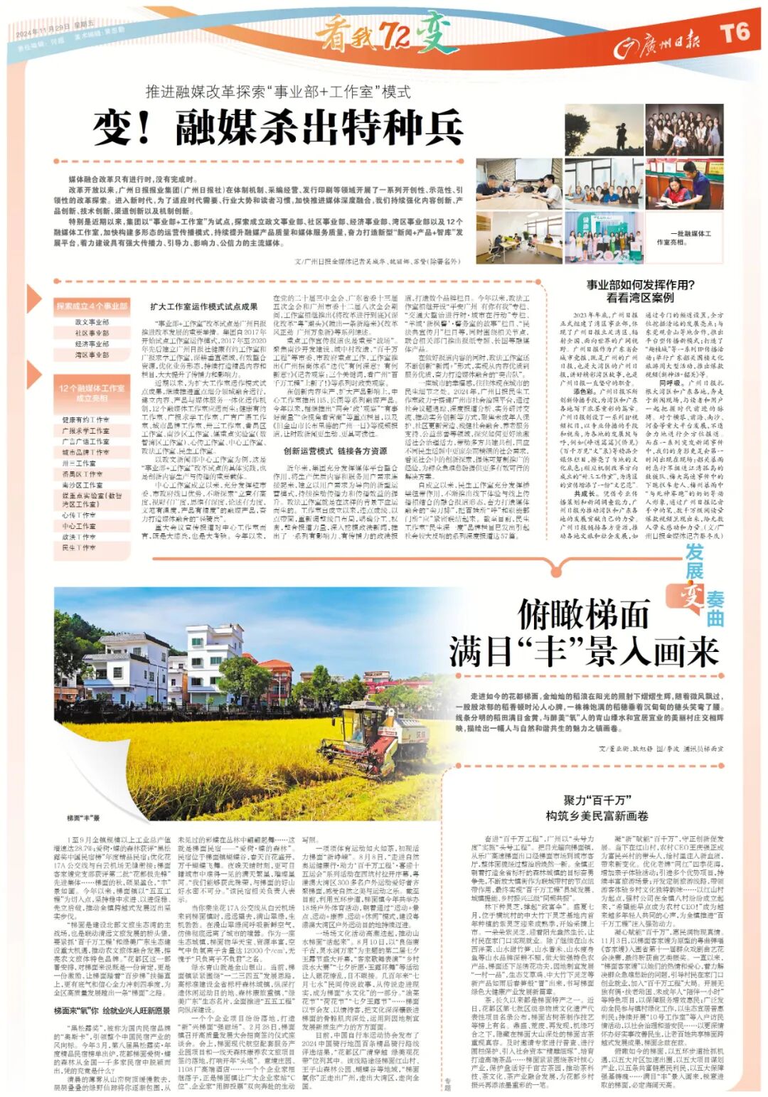 改革开放以来,广州日报报业集团(广州日报社)在体制机制、采编经营、发行印刷等领域开展了一系列开创性、示范性、引领性的改革探索。进入新时代,为了适应时代需要、行业大势和读者习惯,加快推进媒体深度融合,我们持续强化内容创新、产品创新、技术创新、渠道创新以及机制创新。特别是近期以来,集团以“事业部+工作室”为试点,探索成立政文事业部、社区事业部、经济事业部、湾区事业部以及12个融媒体工作室,加快构建多形态的运营传播模式,持续提升融媒产品质量和媒体服务质量,奋力打造新型“新闻+产品+智库”发展平台,着力建设具有强大传播力、引导力、影响力、公信力的主流媒体。![]()