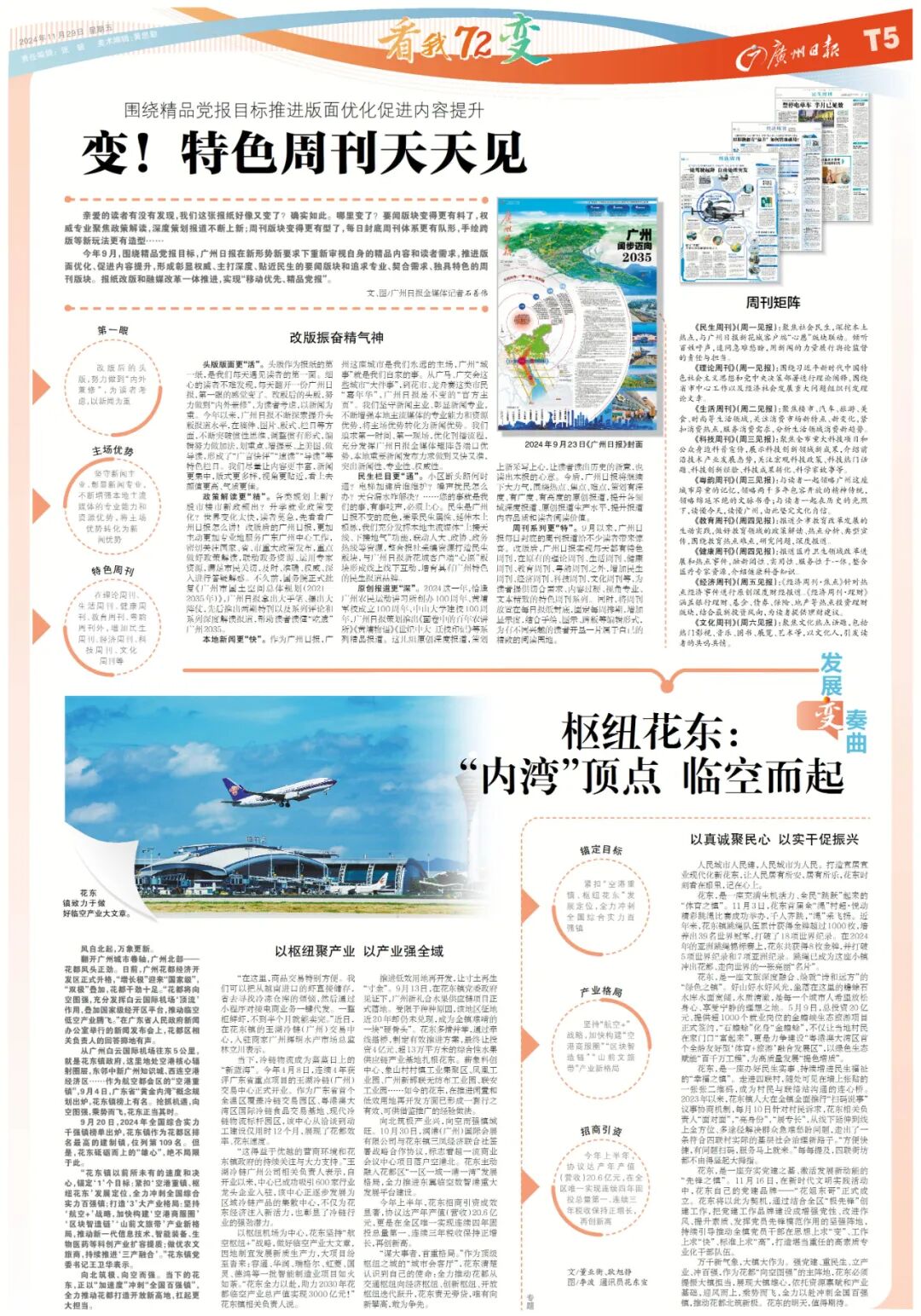 要闻版块变得更有料了,权威专业聚焦政策解读,深度策划报道不断上新;周刊版块变得更有型了,每日封底周刊体系更有队形,手绘跨版等新玩法更有造型……今年9月,围绕精品党报目标,广州日报在新形势新要求下重新审视自身的精品内容和读者需求,推进版面优化、促进内容提升,形成彰显权威、主打深度、贴近民生的要闻版块和追求专业、契合需求、独具特色的周刊版块。报纸改版和融媒改革一体推进,实现“移动优先、精品党报”。![]()