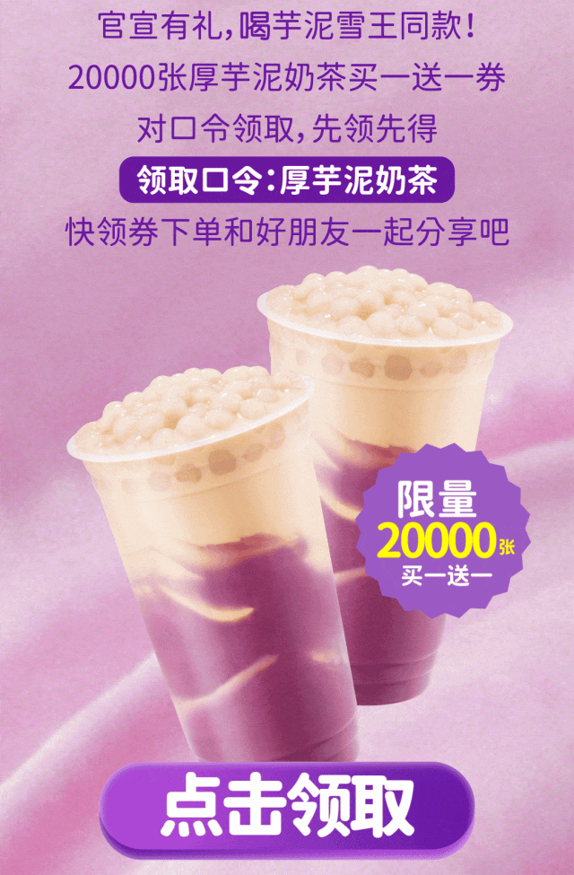 摘要:20000张厚芋泥奶茶买一送一券,点击马上抢!