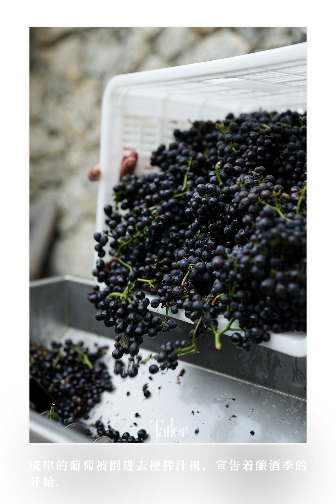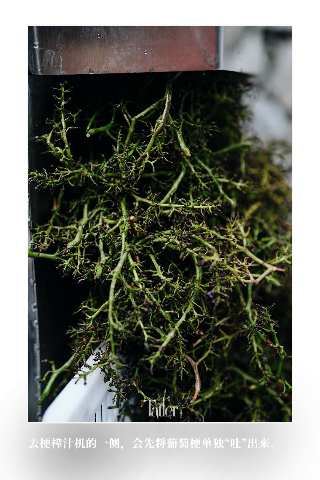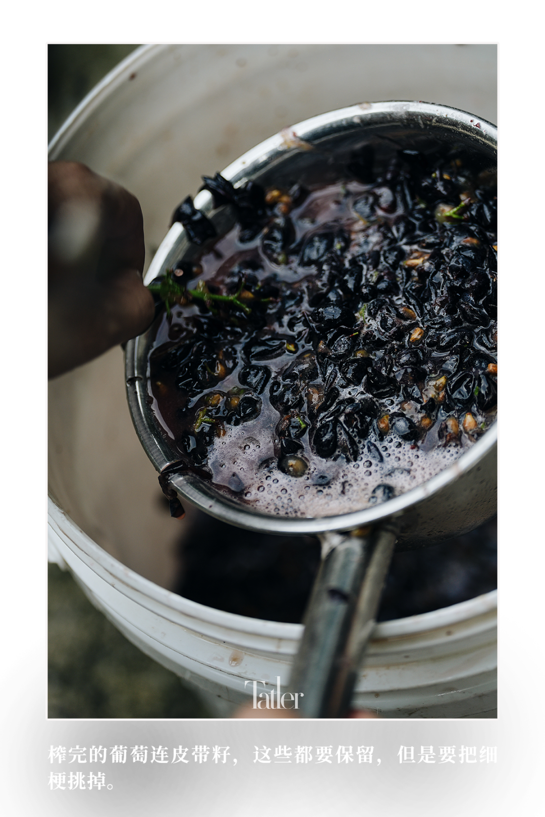 机器发动,庄主全世平亲自将一筐筐成串的葡萄倒进去。机器的侧面有一个口子,会把葡萄梗单独吐出来,榨完的葡萄从机器下面出来,混合着葡萄汁、葡萄皮和葡萄籽,用容器接着,手工挑掉里面的细梗,发酵的阶段,葡萄汁是带皮带籽发酵的。