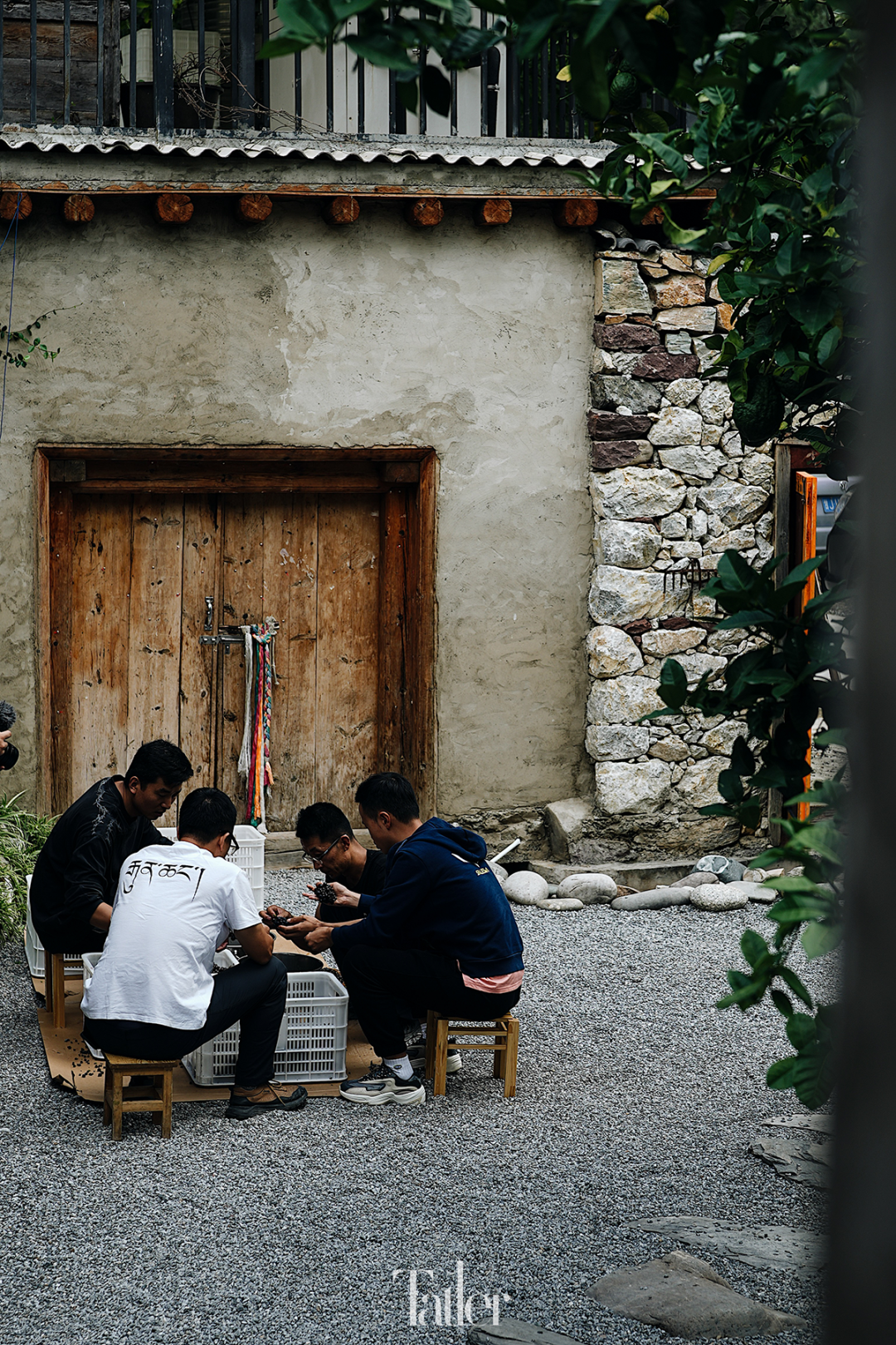 车子停在扎西核桃树酒庄外,这里就是一处两层的民居,跟我们想象中的大酒庄相去甚远。进了院子,眼前一亮,庄主全世平正和员工们在挑拣葡萄,这是当天刚采摘下来的。