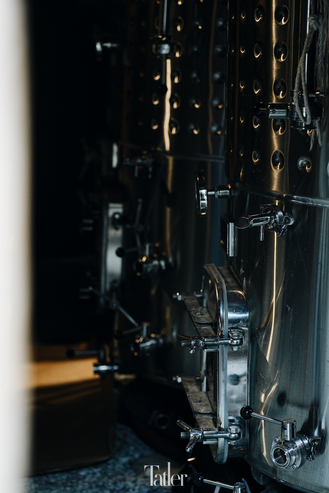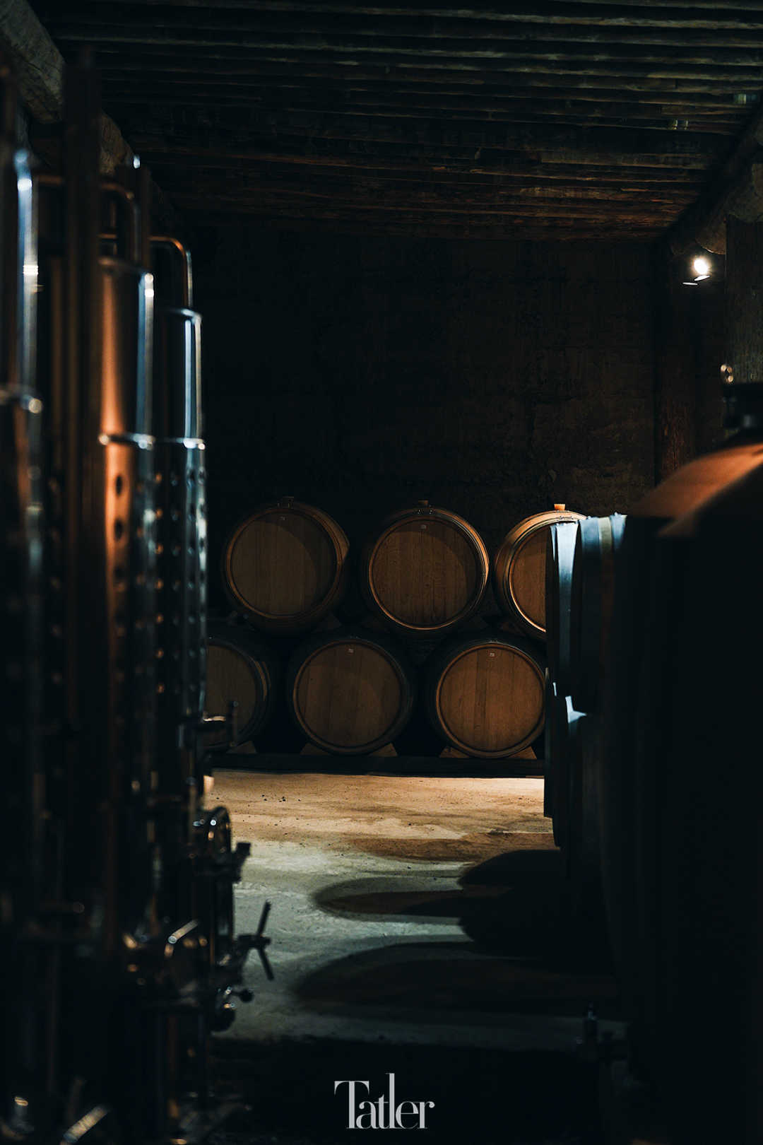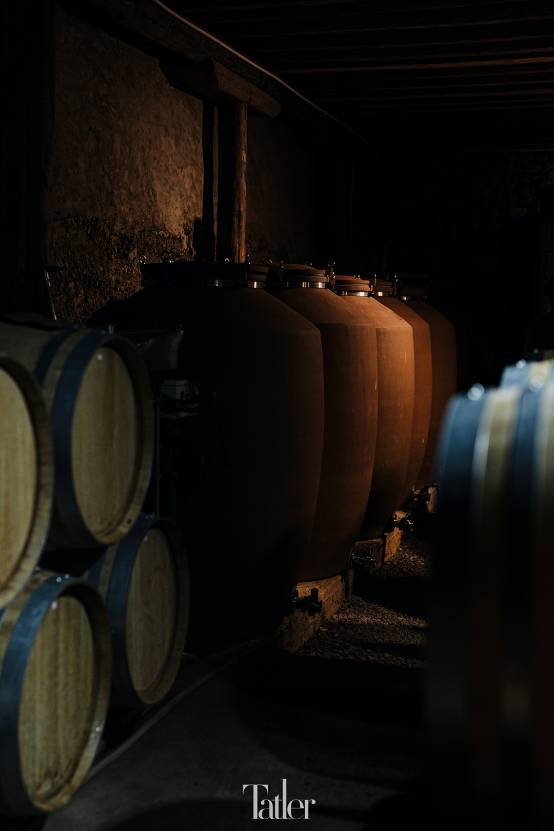 酿酒的车间和酒窖是用这处民居的牛圈改建成的,改建的时候往下挖了五六十公分,增加了挑高,让设备可以安放进来。发酵储藏、橡木桶储藏和瓶储都在这个空间里,需要恒温恒湿,夏天需要空调降温,为了维持湿度(尤其是干燥的冬天),挖了一条水渠从里面穿过。