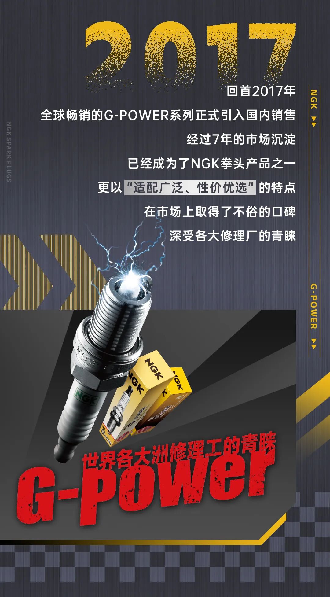 回首2017年,全球畅销的G-POWER系列正式引入国内销售,经过7年的市场沉淀,已经成为了NGK拳头产品之一,更以“适配广泛,性价优选”的特点,在市场上取得了不俗的口碑,深受各大修理厂的青睐。
