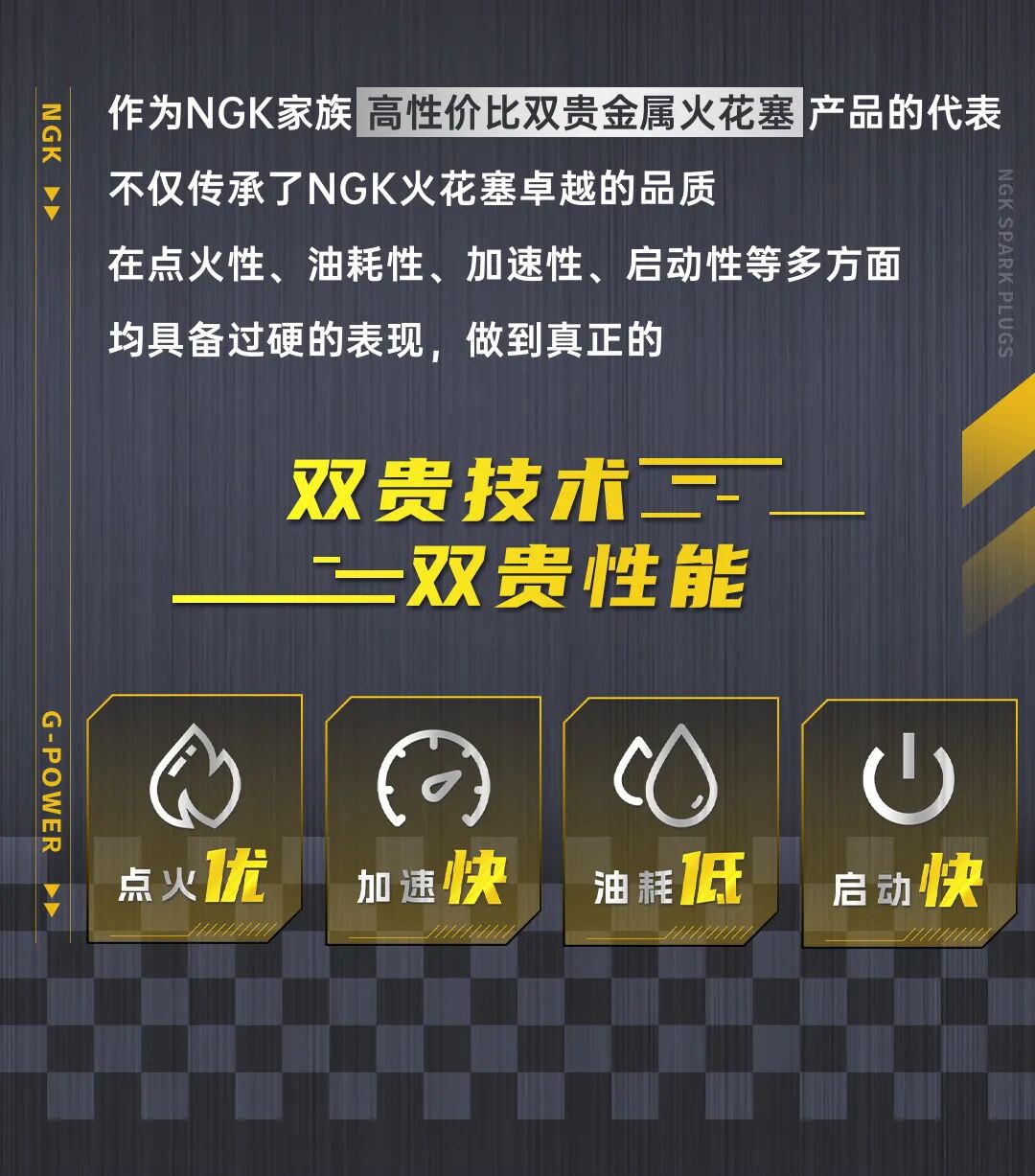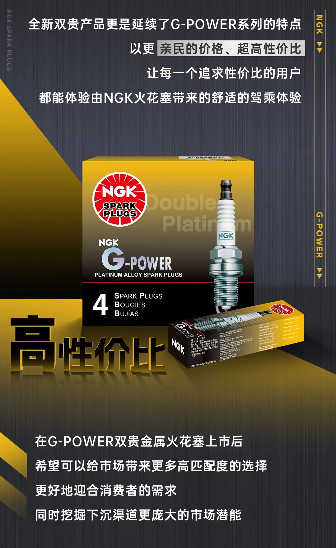 全新双贵产品更是延续了G-POWER系列的特点,以更亲民的价格、超高性价比,让每一个追求性价比的用户都能体验由NGK火花塞带来的舒适的驾乘体验。