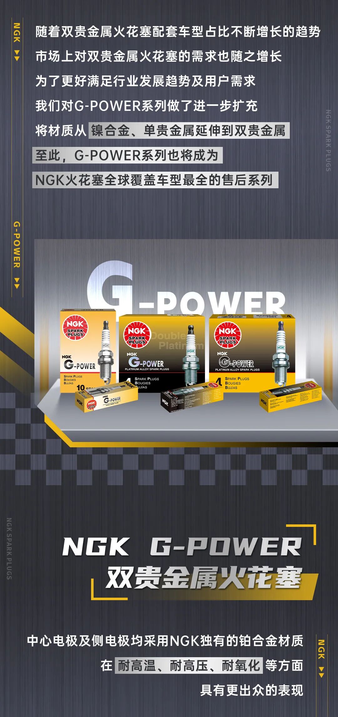 随着双贵金属火花塞配套车型占比不断增长,市场上对双贵金属火花塞的需求也随之增长,为了更好满足行业发展趋势及用户需求,我们对G-POWER系列做了进一步扩充,将材质从镍合金、单贵金属延伸到双贵金属,至此,G-POWER系列也将成为NGK火花塞全球车型覆盖最全的售后系列。