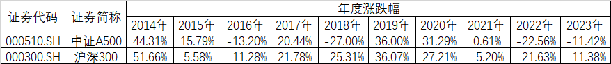 12. 中证A500、沪深300指数近十年完整会计年度业绩见下表:
