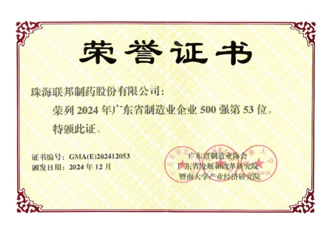 12月3日,2024广东省制造业500强企业峰会在广州举行,会上发布了2024年广东省制造业企业500强名单,珠海联邦制药股份有限公司再次获评入围,荣列“2024年广东省制造业500强企业”第53名,成为引领广东制造高质量发展的500强企业之一。