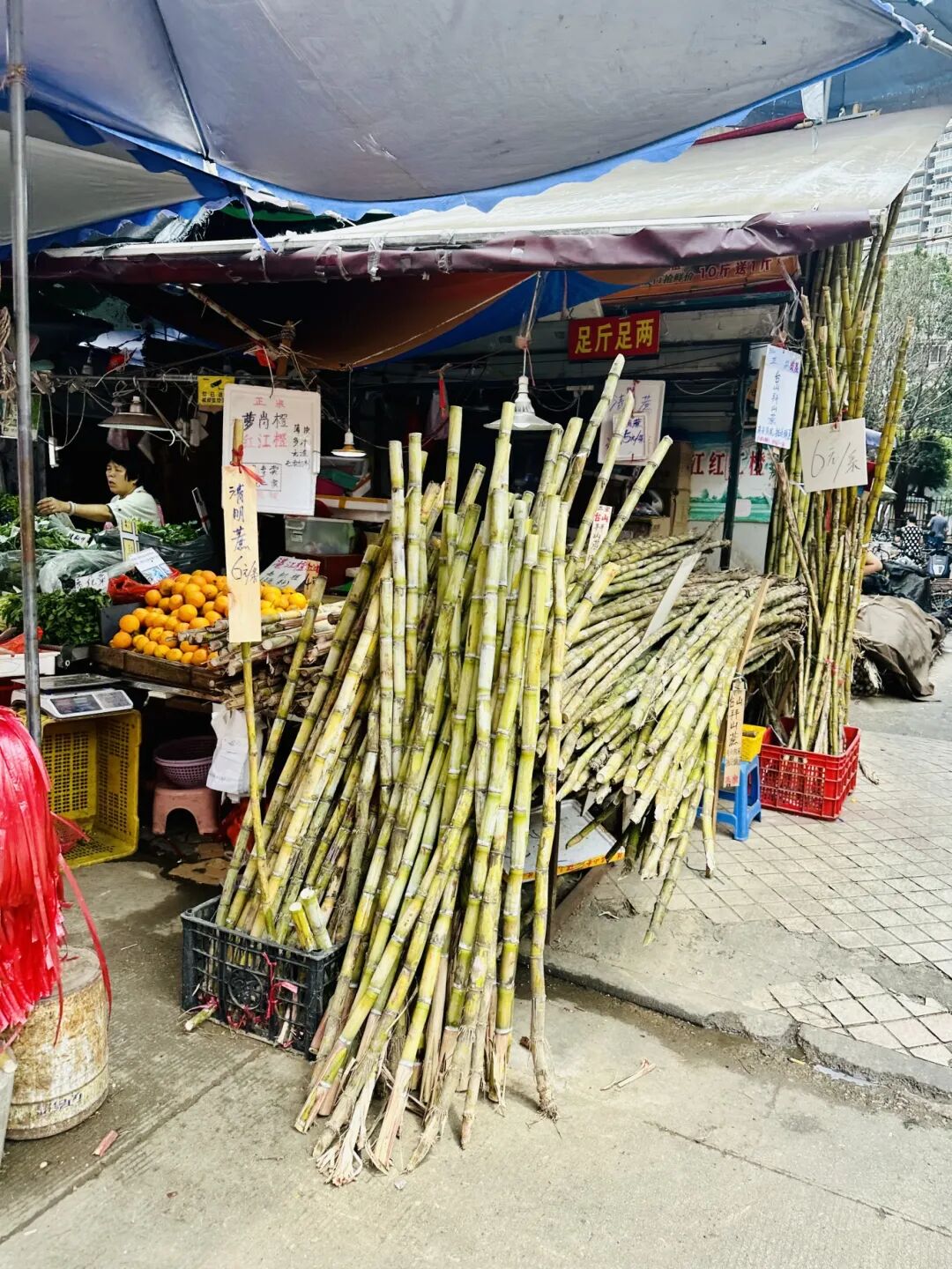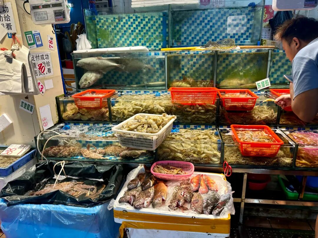 从8号线沙园地铁站C出口出来,进入五一新村,跟紧广州阿妈们的步调,沿着分贝值逐渐高涨的方向一路前行,即可抵达。沙园菜市场由海珠区台联沙园商场、沙园农副产品市场和沙园西华市场三部分构成。整个市场有超过1000个店铺和档口,肉菜、海鲜、水果、干货、熟食、糕点、花店、布店、鞋店、宠物店等一应俱全,甚至有专门卖姜、卖甘蔗的区域,令人叹为观止。大花甲皇、番禺海虾、特大对虾、鲍鱼……200元便可享受各式海鲜盛宴。本地水产物种也极为丰富,如泥鳅、罗非鱼、爽花鳝、中山脆肉鲩等。还有用于煲汤的鳄鱼和水鱼以及扇贝、沙虫、青口、蛏子等品种,相较于其他市场,价格也会稍便宜一些。除了生猛的海鲜,各类新鲜现制的鱼丸、鱼饼在这里也都能买到。新鲜的鸡、鹅、鸭被“赤裸裸”地并列排成一排,平均一个摊位就有十几种鸡,文昌鸡、走地鸡、五谷鸡、湖南土鸡等一应俱全,完全满足广东人对于鸡的要求。除了干货店售卖药材外,一些中草药植物,如艾草、车前草、益母草、五指毛桃和桑叶等,也隐藏于蔬菜摊位之中,成为只有经验丰富的人士能够发掘的秘密宝藏。水果摊位上则摆放着多种热带与本地水果,如具有热带风味的芒果、酸甜味道的桔子、以及透明光泽的提子,种类繁多到使人眼花缭乱。葡萄的种类同样繁多,涵盖了阳光玫瑰、青提、红提、黑加仑等。同时,高价位的水果有如草莓、释迦、莲雾、山竹等。挑选时不妨和热情的摊主攀谈几句,他们通常会告诉你哪些是最新鲜的。