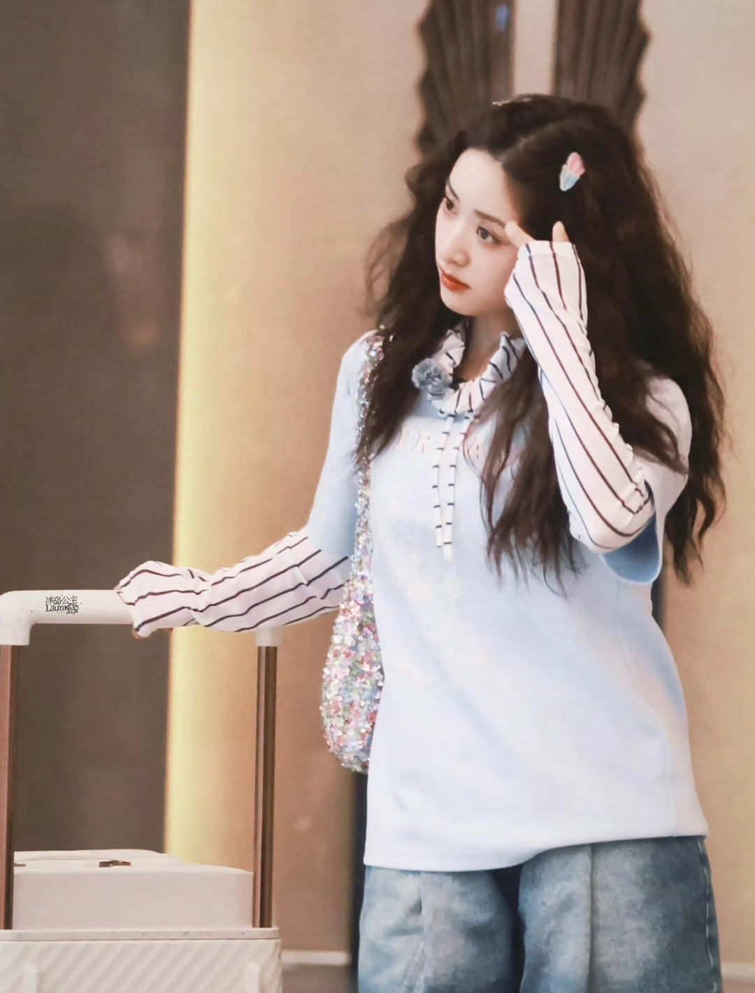 像张予曦这样的羊毛卷,只是扎起一个高马尾,留几撮刘海在发前,就会显得显得非常的大方。