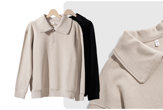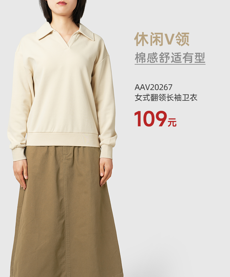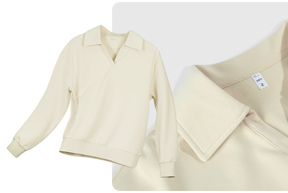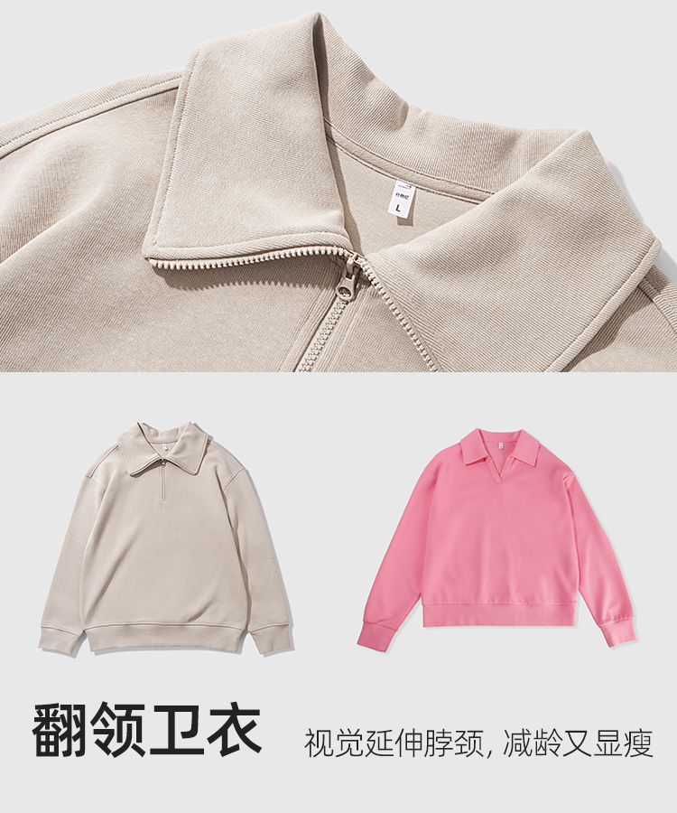 女款翻领卫衣采用聚酯纤维和棉混纺,经特殊工艺织造而成的CVC健康布,它既保留了棉的舒适感和透气性,又有聚酯纤维出色的保型性,耐磨耐穿。适度露出锁骨的V字翻领设计,上身简洁大方,好穿不挑年龄;后领人字带压条定型设计,让领部更加服贴牢靠,一年穿三季也不用担心变形。