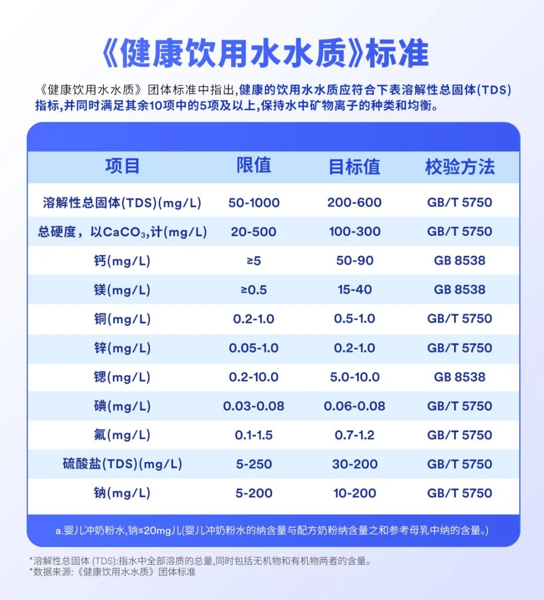 我国于2021年起正式实施《健康饮用水水质》团体标准,定义健康饮用水 (healthy drinking water)在满足国家标准 GB 5749《生活饮用水卫生标准》规定的基础上,健康饮用水 (healthy drinking water) 需去除对人体的危害物质,并保留水中原有且均衡的营养、和健康必需的微量矿物元素 (符合下表中溶解性总固体指标,同时满足其余10项中的5项及以上)。