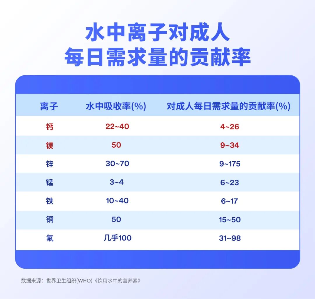在世界卫生组织WHO的专辑《饮用水中的营养素》中,学者亦指出,对于某些特定的微量元素和电解质,饮用水的贡献率占总膳食摄入的1% - 20%。其中,尤以钙和镁通过水提供的量可高达每日摄入量的20%!